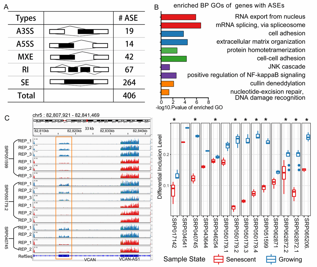 Increasing evidence suggests that dysregulation of splicing factors and the production of key splice variants may attribute to cellular senescence or ageing-associated phenotypes [7]. However, a global transcriptomic landscape of AS program and the splicing regulatory factors are still largely unknown in CS. The rapid accumulation of RNA-seq data in public databases makes it possible to perform meta-analysis on transcriptomes across studies related with CS.