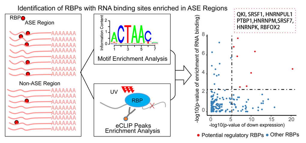 The binding peaks with format of “bed narrowPeak”, defined by CLIPper [57], of eCLIP-seq data were extracted from ENCODE. First, only significantly enriched peaks, with fold enrichment ≥3 and p-value ≤10-5, were retained for the following analysis. Second, the ASEs and non-ASEs (defined in motif enrichment analysis section) were overlapped with filtering peak results respectively by using BEDTools [58]. Finally, two groups of events with or without high-confidence peaks were counted separately to determine the enrichment for each RBP via Fisher’s exact test (one-sided test). Fisher’s combining method was used to integrate the p-values of the enrichment result of motif scanning and eCLIP peaks to assess the RNA binding ability of each RBP. We applied fdr adjustment to the combined p-value and set the threshold as 0.05. Only the RBPs observed with significant q-values in both of two combination methods were defined as enriched ones.