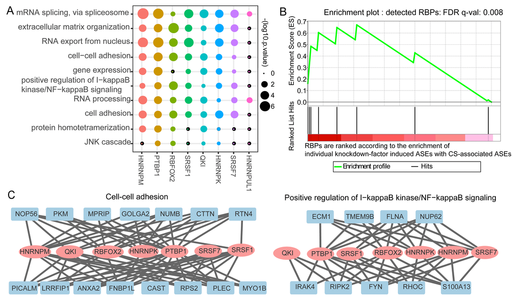 To further validate the potential regulatory roles of these detected CS-associated splicing regulatory RBPs, we compared the overlap between differential splicing events identified from RBP knockdown experiments and the CS-associated differential splicing events. First, we collected 121 groups of individual RBP knockdown RNA-seq data of HepG2 cell line from ENCODE project [26]. Then, we identified the differential splicing profiles upon single RBP knockdown and compared the overlap between the RBP knockdown-induced splicing alterations with the 406 CS-associated differential splicing events. RBPs were ranked according to their overlap enrichment statistics for 121 RBPs. Finally, Gene Set Enrichment Analysis (GSEA) [27] result showed that eight predicted CS-associated splicing regulatory RBPs were among the top-ranked RBPs (Figure 4B, Table S9). It should be noted that, the most top three enriched RBPs, namely, QKI, SRSF1 and HNRNPK, were among our predicted CS-associated splicing controllers.