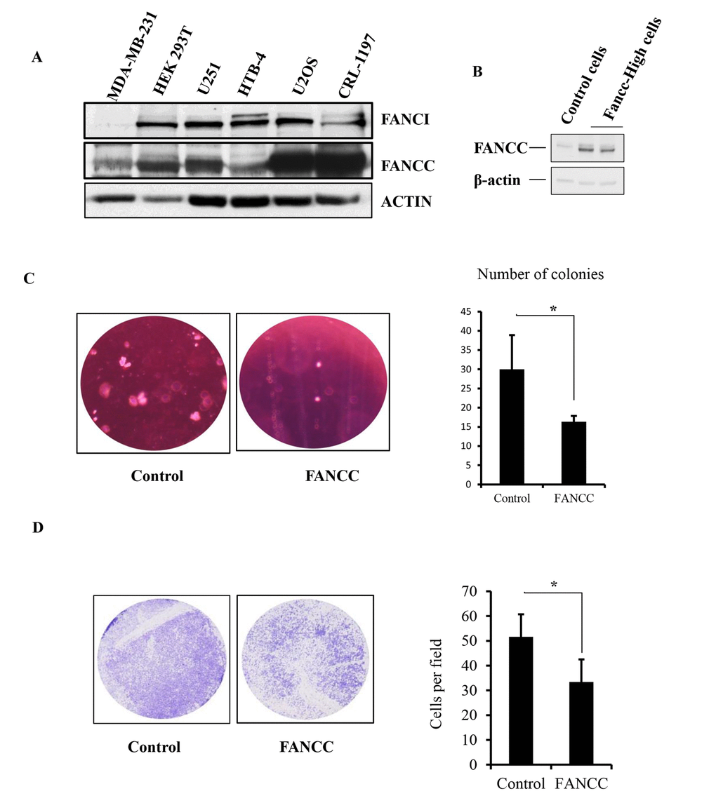 Trans-well assay was carried out using Matrigel Invasion Chamber, 24 well plates 8.0 Micron purchased from Coring. Briefly, 2X104 cells were cultured in Matrigel well plates with two types of cells (Control and FANCC) respectively. Cells that were not migrated were swapped; while cells that migrated into the other side were fixed and stained with crystal violet. The images and numbers of migrated cells were used to indicate cell migration capacity. For soft Agar assay, 2X DMEM/F12 media was used to prepare 0.6% of base agar in 35mm dish and kept 20 minuses in 4ᴼC to make agar completely solidified, 2X103 Cells were plated along with 2XDMEM/F12 in 0.4% of top ager. The dishes were incubated for 2 weeks at 37◦C and stained with crystal violet.