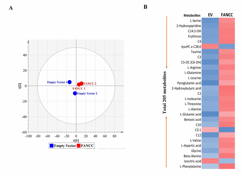 Using targeted (UPLC-MS/MS) and untargeted (GC-TOFMS) metabolomics analysis, we determined the metabolite alteration within the set of MDA-MB-231 cells expressing FANCC at different levels (Figure 1B). A total of 205 metabolites were found to be altered significantly between FANCC-high and FANCC-low cells (Table S1). Principal component analysis (PCA) showed a clear separation between empty vector control/FANCC-low and FANCC-high cell groups, providing the evidence that FANCC changes metabolomes (Figure 2A). Heat map made of 29 metabolites (randomly picked up from 205) shows a vivid difference in the metabolomes of two cell groups (Figure 2B): blue color of metabolites indicates reduced metabolites in the metabolomes of cells; while red color indicates those elevated metabolites. Therefore, FANCC at least performs biologic functions that can ultimately lead to the changes of 205 metabolites, which are a better output to tell the occurred cellular processes initiated by FANCC, in an FA pathway-independent manner.