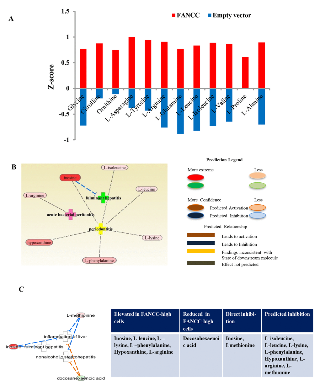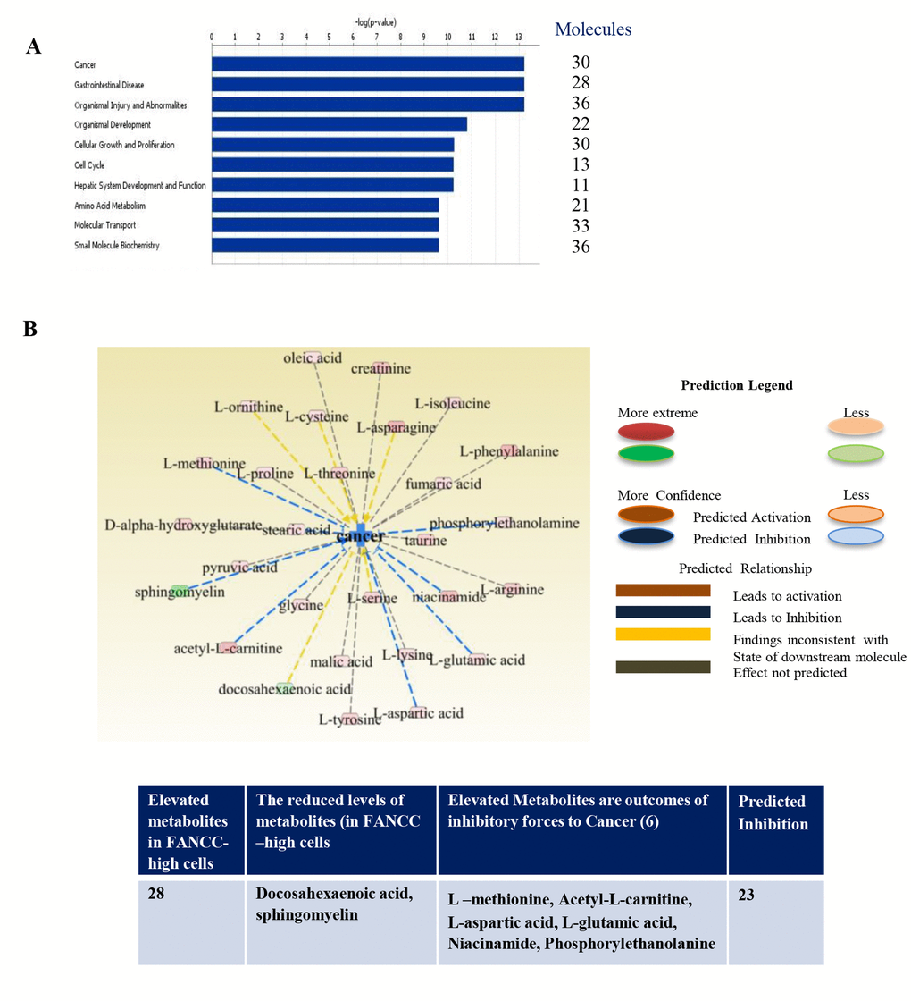 To analyze the specific relations of metabolites in the cells with FANCC potentially for different diseases, we uploaded the identified 205 metabolites to the IPA for functional analysis. For the robustness of the IPA, we normalized metabolic data as described previously [21] on the basis of a total number of cells prepared for the profiling. The metabolic functions (canonical pathways, disease and Bio-functions, molecular and cellular functions, physiological system development and functions, clinical chemistry and hematology, cardiotoxicity, hepatotoxicity and nephrotoxicity) are summarized in Tables S1 and S2. The most significantly biological functions associated with FANCC were cancer (p=4.39×10 -02– 5.93X10 -14, 30 metabolites), inflammatory disease (p=3.67