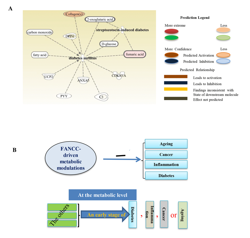 We next checked the distinct metabolites associated with other metabolic disorders. As shown in Figure 4A, metabolites- glycine, citrulline, ornithine, L-asparagine, L-tyrosine, L-arginine, L-glutamine, L-leucine, L-isoleucine, L-alanine, L-valine, and L-proline [30] were elevated significantly in FANCC-high cells compared to the FANCC-low cells. Those metabolites are the signatures associated with aging inhibitory cellular processes, and FANCC thus can be directly implicated to also play crucial roles in the protection of humans from aging. More importantly, we also found that the levels of metabolites [the inosine [31] l-leucine, l-isoleucine, l-phenylalanine [32], hypoxanthine [33], and L-arginine [34]] were substantially changed in FANCC-high cells, which were directly related to inflammatory disease periodontitis (Figure 4B). Interestingly the level of inosine is 20 times higher in the cells carrying a high level of FANCC expression. Furthermore, we found the metabolites leading to another metabolite-disorder diabetes-mellitus (DM) (fumaric acid, fatty acid, D-glucose, carbon monoxide, collagens, 2-oxoglutaric acid) were altered in FANCC-high cells (Figure 5 A). Among those metabolites, signature ones (fumaric acid and collagens [35,36] to inhibitory DM processes were elevated (colored) in FANCC-high cells. While those metabolites that were anticipated to promote DM [35,36], however, were decreased (uncolored). Together, these findings suggest that FANCC is involved in the regulation of various disorders from cancer, aging, to inflammation as well as to DM, consistent with DM-prone mice deficient in FANCC expression [18].