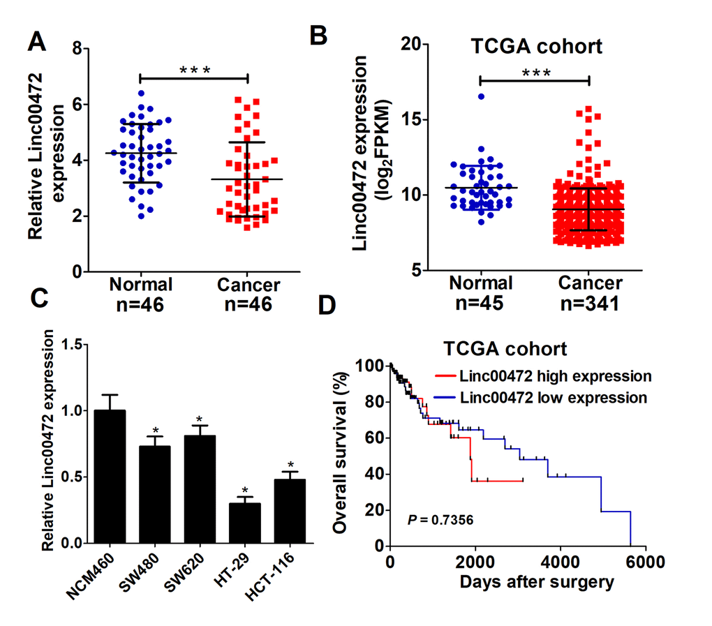 To determine whether Linc00472 was dysregulated in CRC, qRT-PCR was performed to detect Linc00472 expression in 46 pairs of CRC tumor and adjacent non-tumor tissues. As showed in Figure 1A, Linc00472 levels was significantly down-regulated in tumor tissues compared with adjacent normal tissues, which was further verified by TCGA cohort analysis (Figure 1B). Moreover, the expression level of Linc00472 was distinctly decreased in CRC cells (SW480, SW620, HT-29 and HCT-116) in comparison with the immortalized human colonic epithelial cell line NCM460 (Figure 1C). A previous study reported that low Linc00472 expression led to poor prognosis in breast cancer [16]. Therefore, we further investigated its prognostic value in CRC using TCGA dataset. Kaplan–Meier survival analysis revealed that no significant difference existed between Linc00472 levels and overall survival of CRC (P = 0.7356, log-rank test) (Figure 1D), similar to another study on epithelial ovarian cancer [14]. All these data suggested that Linc00472 was down-regulated in CRC tissues and cells.