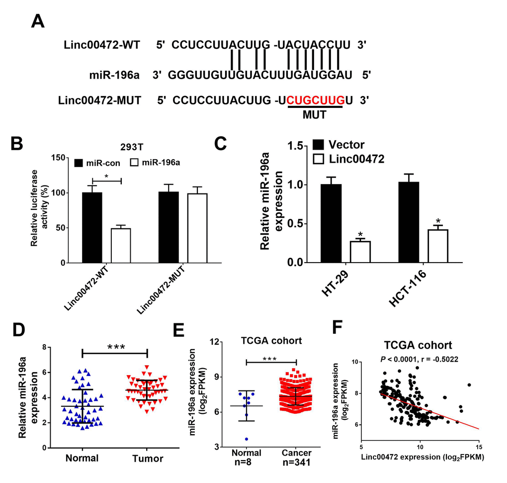 To further investigate the molecular mechanism of Linc00472 in CRC progression, starBase v2.0 (http://starbase.sysu.edu.cn/) was used to predict Linc00472 targeting miRNAs. As shown in Figure 3A, miR-196a was a predicted target of Linc00472. To validate the direct interaction between mir-196a and Linc00472, the luciferase reporter assay was performed. As expected, the relative luciferase activity of Linc00472-WT was evidently reduced by elevated miR-196a (Figure 3B). However, miR-196a overexpression had no significant effect on luciferase activity of Linc00472-MUT in 293T cells. Moreover, up-regulation of Linc00472 remarkably inhibited miR-196a expression in HT-29 and HCT-116 cells (Figure 3C). Furthermore, miR-196a expression was obviously increased in CRC tissues (Figure 3D), further confirmed by TCGA cohort analysis (Figure 3E). Spearman’s correlation analysis also found that miR-196a expression was inversely associated with Linc00472 level in CRC tissues from TCGA cohort (Figure 3F). All these findings demonstrated that Linc00472 down-regulated miR-196a expression by direct interaction.