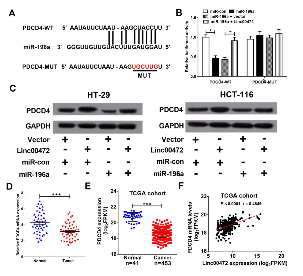 To further identify target genes of miR-196a, miRanda software was used to predict miR-196a targets. PDCD4 was found to be a potential target of miR-196a (Figure 4A). To further verify the prediction, we performed luciferase reporter assay. Our results indicated that miR-196a overexpression strikingly reduced luciferase activity of wide-type PDCD4 (PDCD4-WT), which was eliminated by elevated Linc00472 in 293T cells (Figure 4B). However, the luciferase activity of mutant type PDCD4 (PDCD4-MUT) had no obvious change among all groups. The result of western blot analysis revealed that Linc00472 promoted PDCD4 expression while miR-196a suppressed PDCD4 expression in HT-29 and HCT-116 cells (Figure 4C). Additionally, Linc00472 could reversed the inhibitory effect of miR-196a on PDCD4 expression. Oppositely, miR-196a overexpression could eliminate the inductive effect of Linc00472 on PDCD4. Furthermore, PDCD4 levels was noticeably decreased in CRC tissues (Figure 4D), further verified by TCGA dataset analysis (Figure 4E). Correlation analysis revealed a positive correlation between PDCD4 and Linc00472 in CRC tissues from TCGA dataset (Figure 4F). These evidences demonstrated that Linc00472 could positively modulate PDCD4 expression by sponging miR-196a.