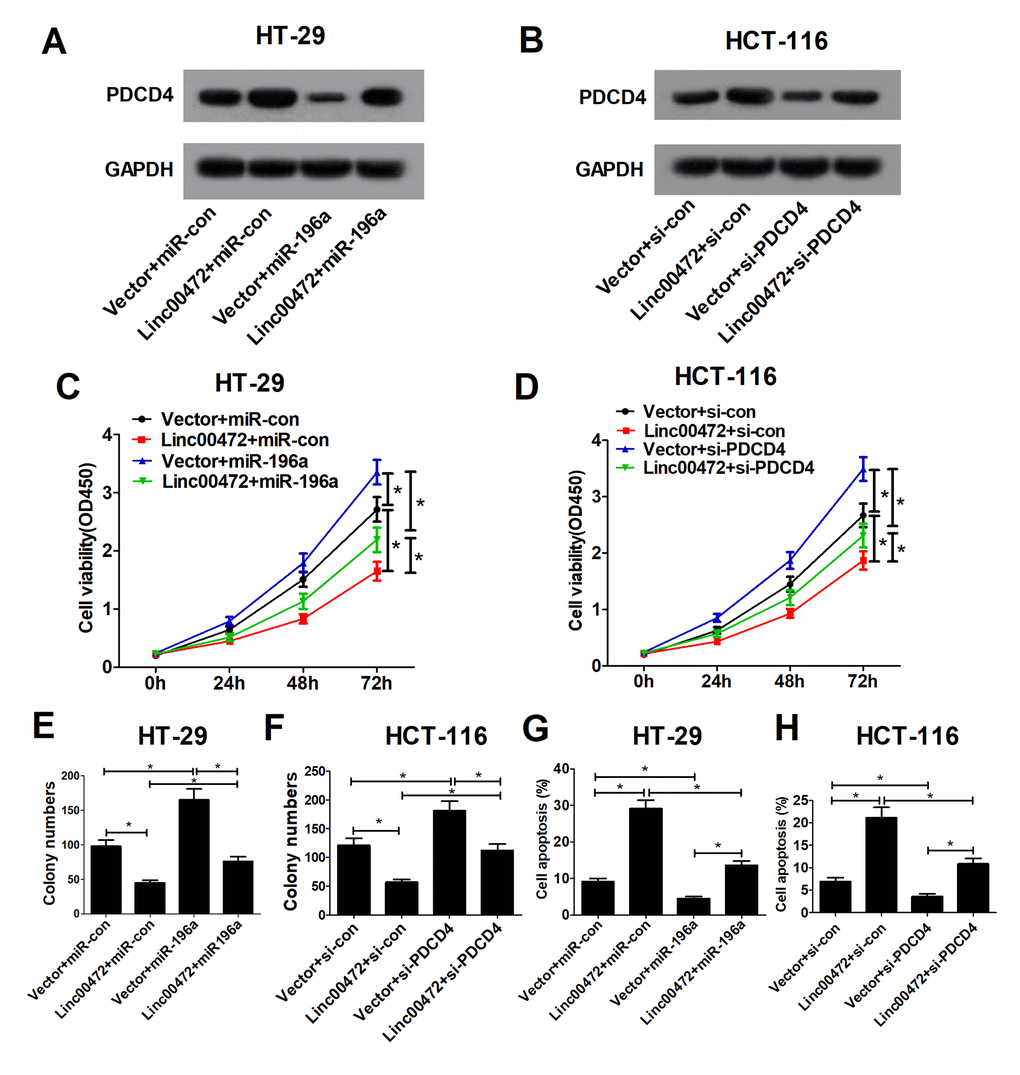 It was further investigated that whether miR-196a or PDCD4 implicated in the effect of Linc00472 on proliferation and apoptosis in CRC cells. As displayed in Figure 5A, Linc00472 could abolish the inhibitory effect of miR-196a on PDCD4 expression. Also, miR-196a also could decline Linc00472-mediated elevation in PDCD4 expression. Additionally, PDCD4 knockdown diminished Linc00472-induced increase in PDCD4 expression (Figure 5B). Function analysis discovered that miR-196a overexpression or PDCD4 knockdown promoted proliferation and induced apoptosis in CRC cells, however, the pro-tumor effect of up-regulated miR-196a or down-regulated PDCD4 was reserved by Linc00472 overexpression. Moreover, miR-196a or si-PDCD4 weakened the anti-tumor effect of Linc00472 on CRC cells (Figure 5C-H). These data recommended that Linc00472 exerted its tumor suppressive role in CRC cells by down-modulating miR-196a and elevating PDCD4.