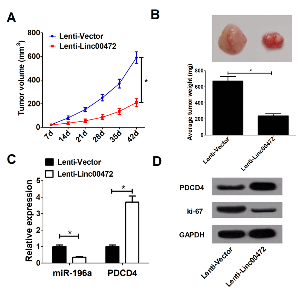 To further explore the effect of Linc00472 on tumor growth in vivo, HT-29 cells stably transfected with lenti-Vector or lenti-Linc00472 were subcutaneously injected into nude mice. Linc00472 overexpression hindered tumor growth in nude mice, evidenced by suppressed tumor volume (Figure 6A) and weight (Figure 6B). Moreover, Linc00472 overexpression led to decreased miR-141 expression and increased PDCD4 expression in vivo (Figure 6C). Furthermore, Ki-67 protein level was distinctly down-regulated in Linc00472 overexpressing mice tumor tissues (Figure 6D). Collectively, Linc00472 inhibited tumor growth in vivo.