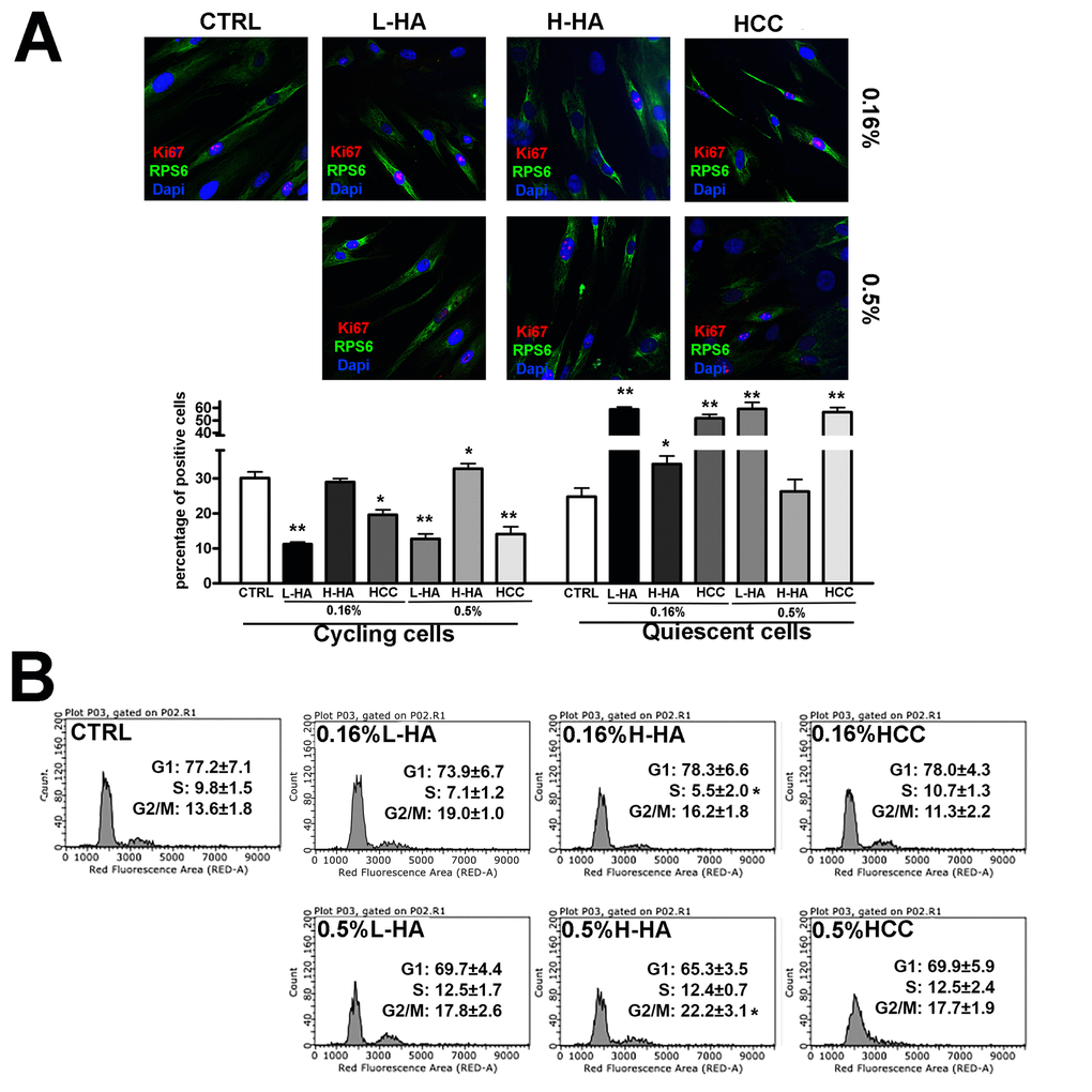 We evaluated the effect of the several HA formulations on MSC cultures by determining the Ki67 pRPS6 immunostaining in every tested condition. Cells were incubated for three days in media supplemented with the different HA formulations. In this way, we identified the actual proportion of cycling cells (Fig. 1A).