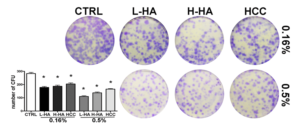 We prepared L-HA, H-HA and HCC mixtures and mixed them with culture media obtaining low viscous solutions. The final concentration of each hyaluronan mixture in the viscous solution was either 0.16% or 0.5%. We seeded 5 × 103 cells/cm2 in alpha-MEM containing 10%FBS and bFGF. After 24 hr, medium was replaced with the above indicated viscous solutions and cells were incubated for different time points.
