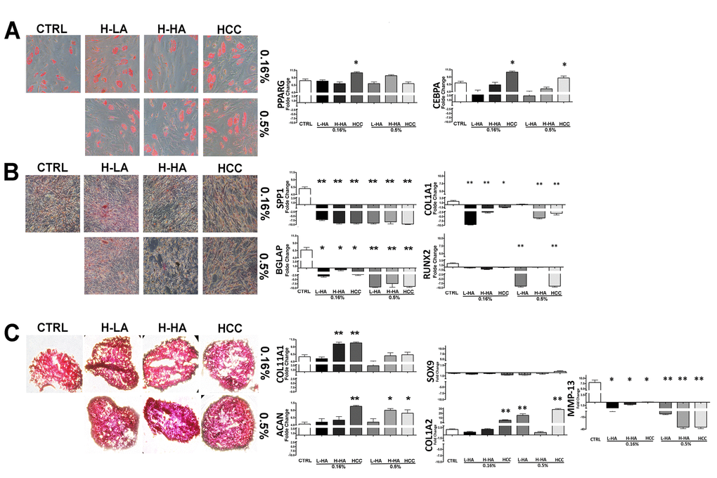 We evaluated how HA mixtures could affect stemness and multipotentiality of MSCs. To this end, we carried out a CFU assay on the MSC cultures to test their clonogenicity (i.e., their ability to expand at a single-cell level), which is a fundamental feature of self-renewing stem cells. We also evaluated if the tripotential differentiation capacity of MSCs was influenced by HA formulations. Adipo-chondro-osteo differentiation in the presence of each of the tested compounds allowed us to analyze this aspect [13]. The number of MSC clones was reduced after incubation with all the analyzed HA mixtures (Fig. 3). The reduction in CFU clones that we observed prompted us to evaluate if this decrement affected, in the same manner, all the different progenitors or if there was a bias toward a specific lineage-committed clone. MSCs, which we cultivated with the different HA formulations, were then incubated in osteogenic, adipogenic, and chondrogenic differentiating media. These three differentiation pathways were preserved in the presence of the HA mixtures as detected by Alizarin Red S, Oil Red O, and Alcian Blue stainings, respectively (Fig. 4A-B-C). To get further insights on the differentiation process, we analyzed by qRT-PCR the expression levels of several differentiation markers. The mRNA levels of PPAR-gamma (PPARG) and CEBP-alpha (CEBPA), two markers of adipogenesis, were upregulated in the presence of 0.16% HCC compared with the control differentiation cultures. In the other experimental conditions, no significant differences were observed, or in some cases, we evidenced a decline in CEBP-alpha levels (Fig. 4A).