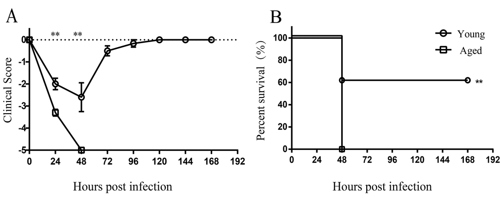 To determine whether susceptibility to A. baumannii infection was increased with advanced age, young and aged mice were infected by non-invasive intratracheal inoculation of LAC-4 (5×106 CFU). Survival rate and clinical score of mice were monitored for 7 days. After infection, the clinical signs of aged mice were more severe than those of young mice (Figure 1A). All aged mice appeared very sick, moved slowly, and hunched at 24 hours post infection (hpi). Mortality of aged mice was 100% within 48 hours after LAC-4 infection, whereas 60% of young mice survived (Figure 1B). The results indicate aged mice are more susceptible to respiratory A. baumannii infection than young mice.