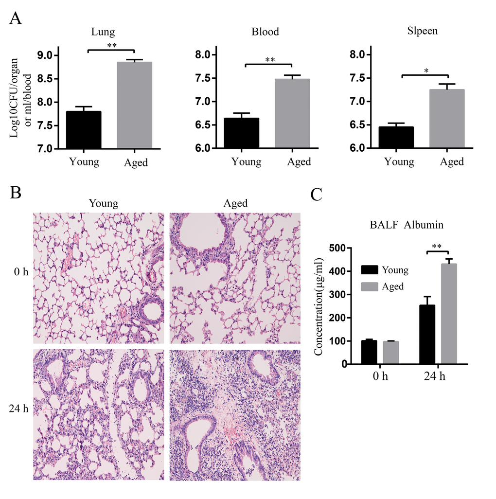 Next, bacterial burdens in the lung, blood, and spleen at 24 hpi were evaluated. Aged mice had more than 10-fold higher bacterial burdens in lungs compared with young mice. More importantly, aged mice had remarkably increased bacterial burdens in blood and spleen compared with young mice, showing higher level of extrapulmonary dissemination of bacteria after infection (Figure 2A).