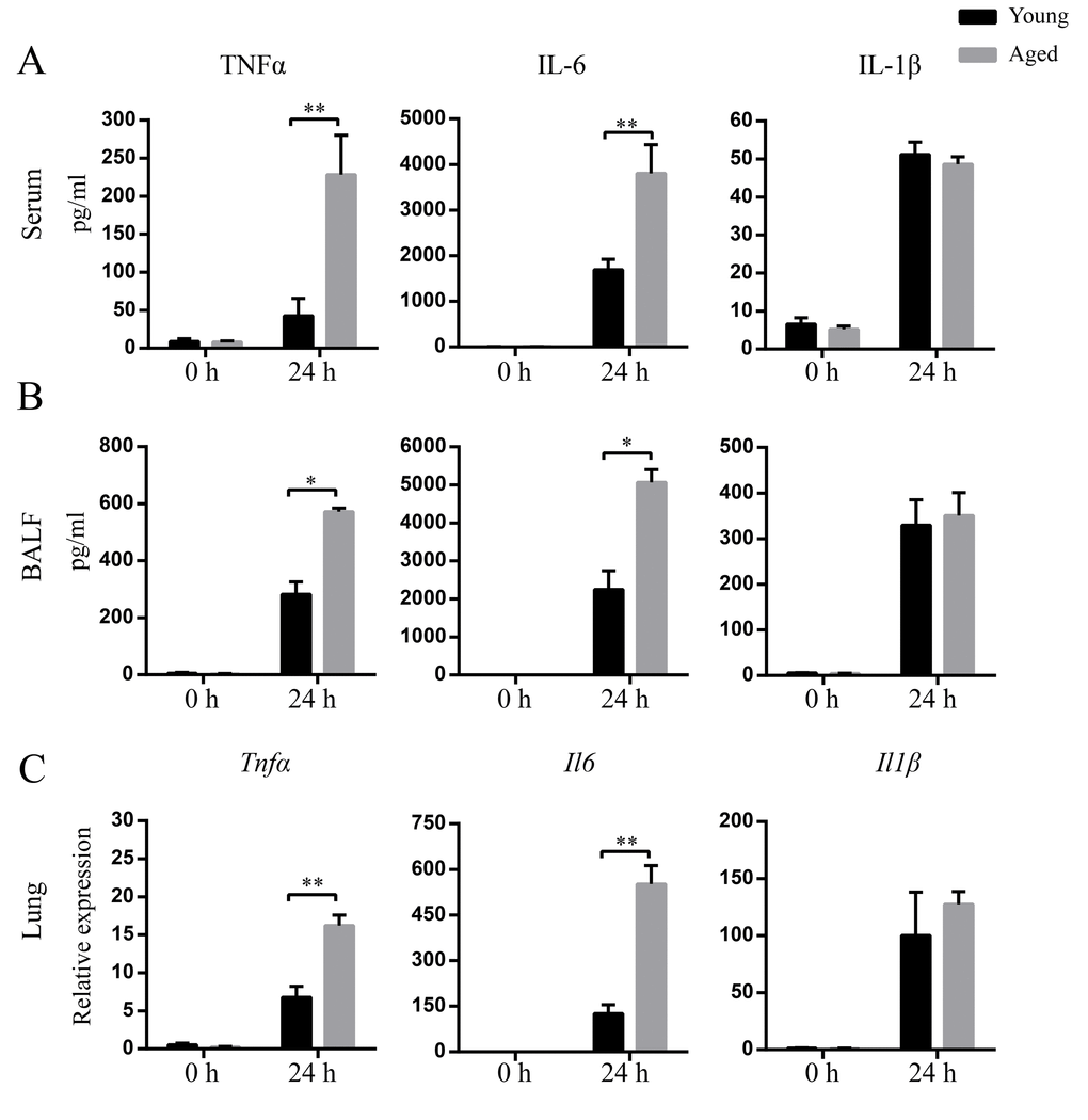 Next, we evaluated inflammatory cytokine levels in response to A. baumannii infection in aged and young mice. The basal levels of TNF-α, IL-1β, and IL-6 in BALF and serum were comparable between aged and young mice. At 24 hpi, TNF-α and IL-6 levels in serum and BALF from aged mice were significantly higher than those from young mice. However, there was no significant difference of IL-1β levels in BALF and serum between infected young and aged mice (Figure 3A and B). In addition, TNF-α and IL-6 mRNA expression in the lungs from infected aged mice were significantly higher than those from infected young mice, whereas mRNA expression of IL-1β exhibited similar fold change in infected young and aged groups (Figure 3C). The data suggest aging results in a markedly local and systemic inflammation characterized by enhanced TNF-α and IL-6 expression.