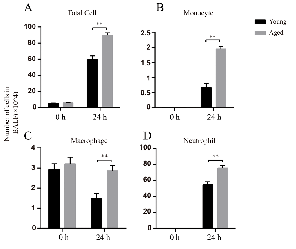 Increased inflammatory cell infiltration in BALF in aged mice after infection
