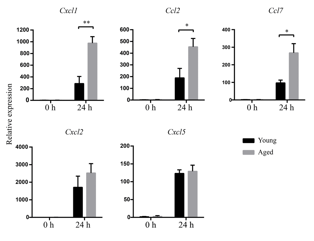 To determine whether increased inflammatory cell infiltration in aged mice is associated with increased chemokine expression, mRNA levels of chemokine in lungs were detected by real-time PCR. The results showed there is no difference of chemokine mRNA expression between uninfected young and aged mice. At 24 hpi, higher mRNA expression of CXCL1, CCL2, and CCL7 in lungs were detected in aged mice than those in young mice (Figure 5). There was no obvious difference in mRNA levels of CXCL2 and CXCL5 between infected young and aged mice. The results suggest increased inflammatory cells are associated with increased levels of CXCL1, CCL2, and CCL7 expression.