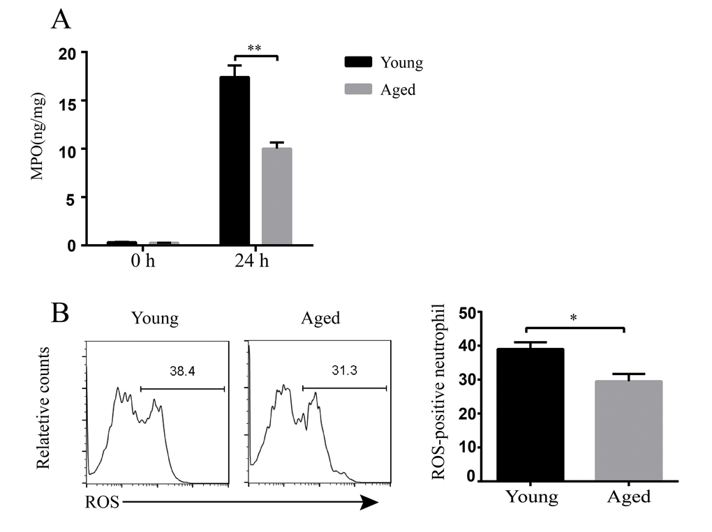 Usually, inflammatory cells are regarded as the first line of host defense against infection. Our data showed aged mice have stronger inflammatory response to A. baumannii infection. But aged mice still had higher bacterial burdens than young mice. Thus, we assumed that the bactericidal abilities of inflammatory cells in aged mice might be impaired. We detected myeloperoxidase (MPO) levels in lungs and reactive oxygen species (ROS) activity of the neutrophils. The results showed basal MPO levels in lung homogenates are similar between uninfected young and aged mice. But MPO levels at 24 hpi were significantly lower in aged mice than in young mice (Figure 6A). In addition, ROS-positive neutrophils in BLAF of aged mice were significantly lower than that in young mice after infection (Figure 6B). These results indicate the bactericidal activity of inflammatory cells is reduced with aging, which might be responsible for the enhanced susceptibility to A. baumannii infection.