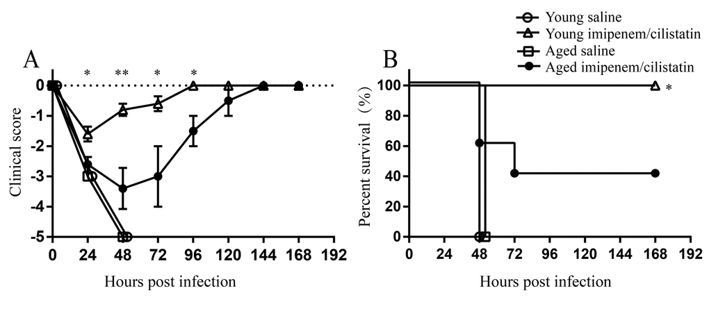 Groups of five young and aged mice were intratracheally infected with 1.5×107 CFU of LAC-4 and treated with imipenem /cilastatin ((20mg/20mg)/kg of body weight/day, twice a day, i.p.) or saline starting 3 h after inoculation for 3 days. Survival rate and clinical score of mice were observed for daily 7 days.