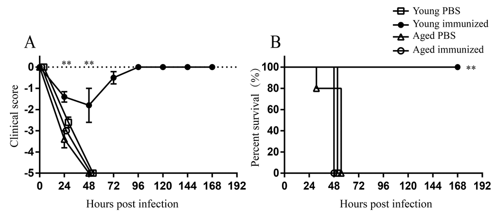 The ffLAC-4 prepared as described was used as a vaccine [37]. Groups of five young and aged mice were intramuscularly immunized with 1×107 CFU of ffLAC-4 in 250 μl PBS or PBS only at day 0. At day 7, the mice were intratracheally challenged with 1.5×107 CFU of LAC-4 in 20 μl PBS. Survival rate and clinical score of mice were observed daily for 7 days.