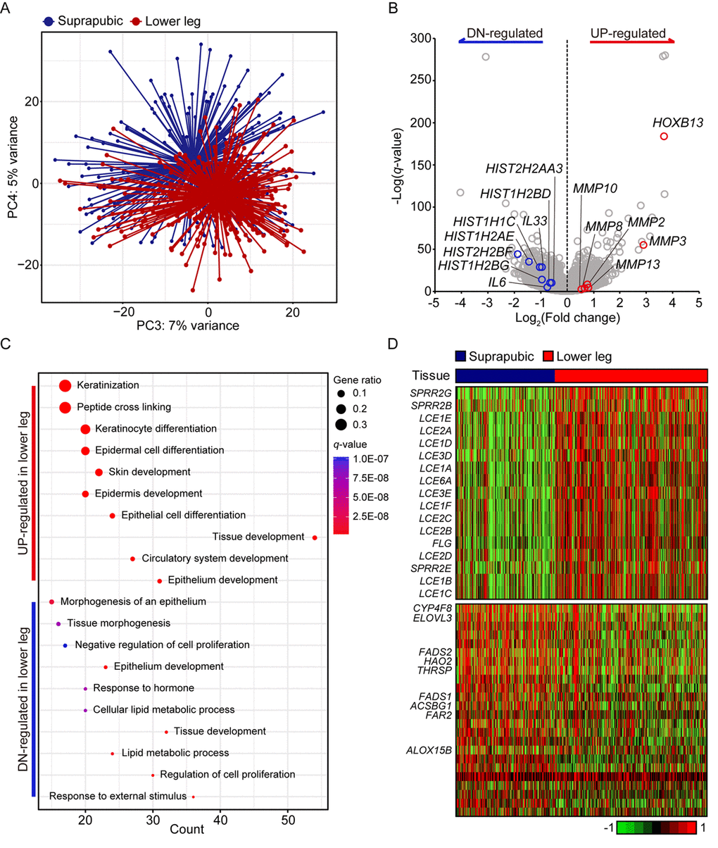 Principle component analysis revealed clear transcriptomic difference between suprapubic and lower leg tissues, possibly due to UV exposure (Figure 1A). Moreover, DEGs between two groups also showed the evident distinction of two tissues in transcriptome level (Figure 1B). Down-regulated DEGs included IL6 and IL33, which are involved in wound heading [9–11], in addition to several histone genes such as HIST2HBF, HIST1H2AE, HIST1H1C, HIST1H2BG, HIST1H2BD, and HIST2H2AA3. The down-regulation of histone genes by external stimuli, which corresponds to our result, was previously reported [12]. This might suggest the decreased histone genes in lower leg was affected by chronic UV exposure. In addition, HOXB13, plays a role in fetal skin development and cutaneous regeneration [13], and several matrix metalloproteinase (MMP) genes including MMP3, MMP13, MMP2, MMP8, and MMP10 were elevated in lower leg. In relation to MMP genes, their up-regulation in photo-damaged skin is well-reported event which induces collagen fragmentation [1,14].