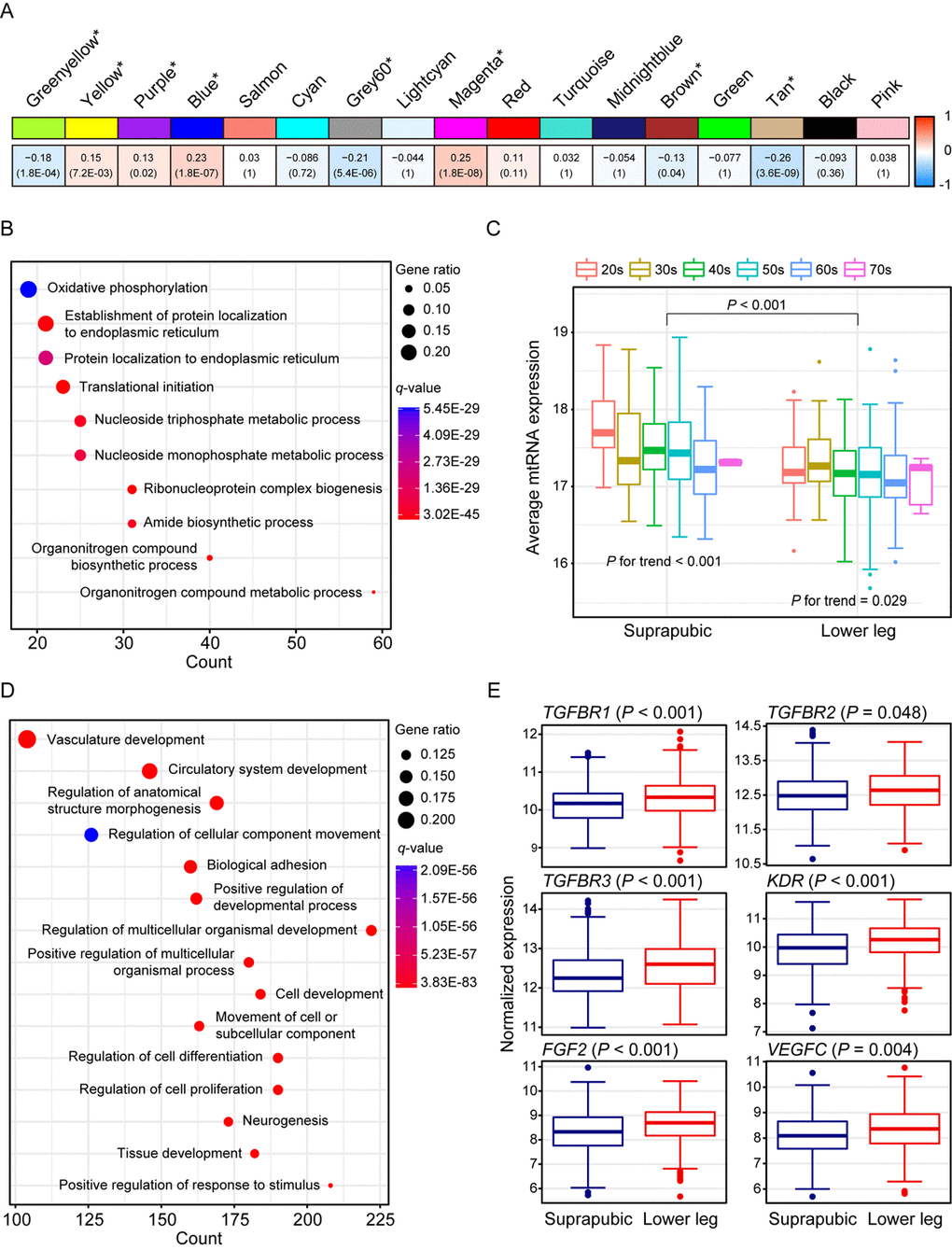 Wrinkle is the most well-known characteristic of aged skin and it is reported that angiogenesis is closely associated with its generation [27–30]. Blue module (R = 0.23 and Bonferroni-corrected P = 1.8E-07) was enriched with various biological processes including ‘vasculature development’, ‘circulatory system development’, and ‘regulation of anatomical structure morphogenesis’ (Figure 2D). Several genes that are involved in angiogenesis including FGF2, KDR, TGFBR1, TGFBR2, TGFBR3, and VEGFC were significantly increased in lower leg relative to suprapubic (Figure 2E).