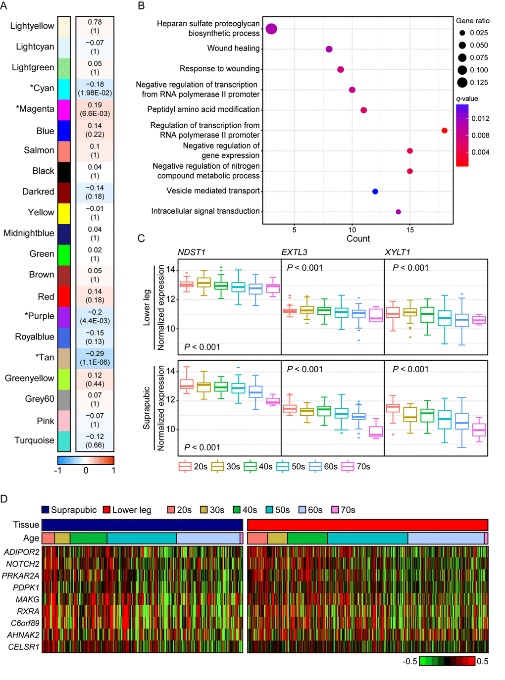 We also presented photo-aging signatures by performing WGCNA using only lower leg skin samples and 21 aging-related modules were constructed and four of them were statistically significant (Figure 3A). In addition, the top 10 genes with the highest connectivity from four significant modules are listed on Supplemental Table 2. The most correlated module was tan (R = -0.29, Bonferroni-corrected P = 1.1E-06) and it was mainly enriched with wound healing related pathways including ‘heparan sulfate proteoglycan biosynthetic process’, ‘wound healing’, and ‘response to wounding’ (Figure 3B). Heparan sulfate is a type of glycosaminoglycans, a group of long-chain carbohydrates with high molecular weight, that are sulfated [33] and proteoglycans play crucial roles in regulating several physiological processes including wound healing [34]. We found three genes, EXTL3, NDST1, and XYLT1, that were involved in ‘heparan sulfate proteoglycan biosynthetic process’ displayed decrement with aging in both tissues (Figure 3C). In particular, NDTS1 was one of top 10 most correlated genes found in this module (Supplemental Table 2). Also, there were nine genes discovered that were enriched in ‘wound healing’ and ‘response to wounding’ (Figure 3D). Those genes were also found in modules which were associated with aging in suprapubic (red and yellow modules; Supplemental Figure 2).