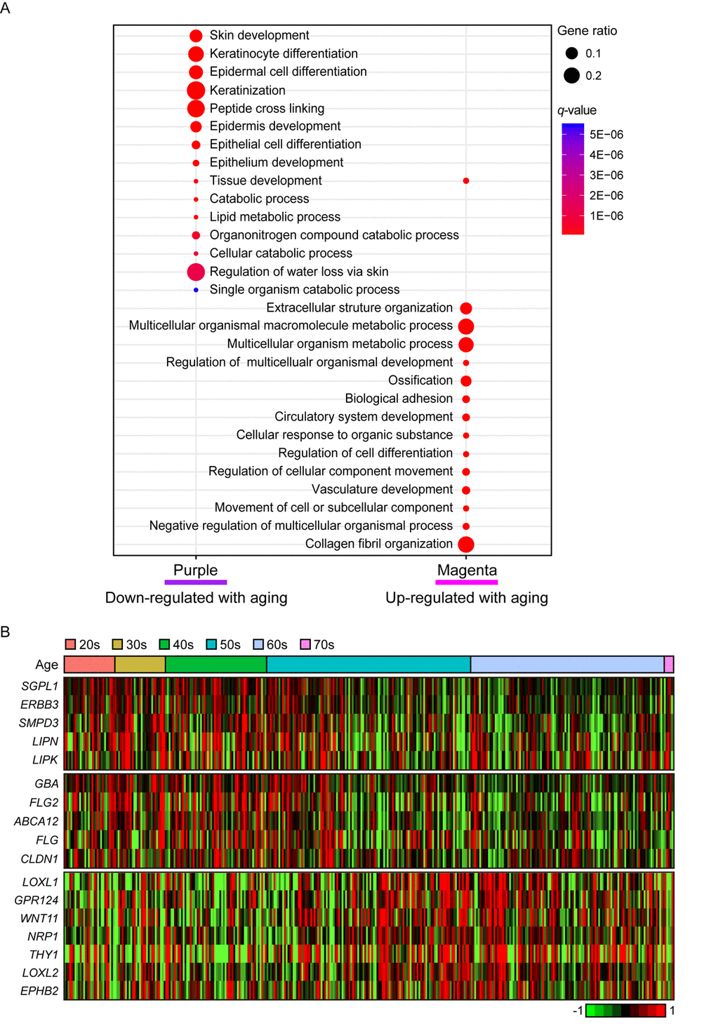 In purple module (R = -0.2 and Bonferroni-corrected P = 4.4E-03), ‘skin/tissue development’, ‘lipid metabolic process’, and ‘regulation of water loss via skin’ were found (Figure 4A). Lipid metabolism and prevention of water loss are known to have roles in skin barrier function and often influenced by aging [35,36]. Genes involved in lipid metabolism such as ERBB3, LIPK, LIPN, SGPL1, and SMPD3 were decreased with aging as well as several water loss regulation genes including ABCA12, CLDN1, FLG, FLG2, and GBA (Figure 4B). Aforementioned genes were not found in statistically significant aging-related module in suprapubic (yellow, salmon, and pink modules; Supplemental Figure 2). In addition, 12 LCE genes were detected as down-regulated with aging (Supplemental Figure 3). However, from suprapubic, those genes were enriched in salmon module which did not change statistically significant with aging (Supplemental Figure 2).