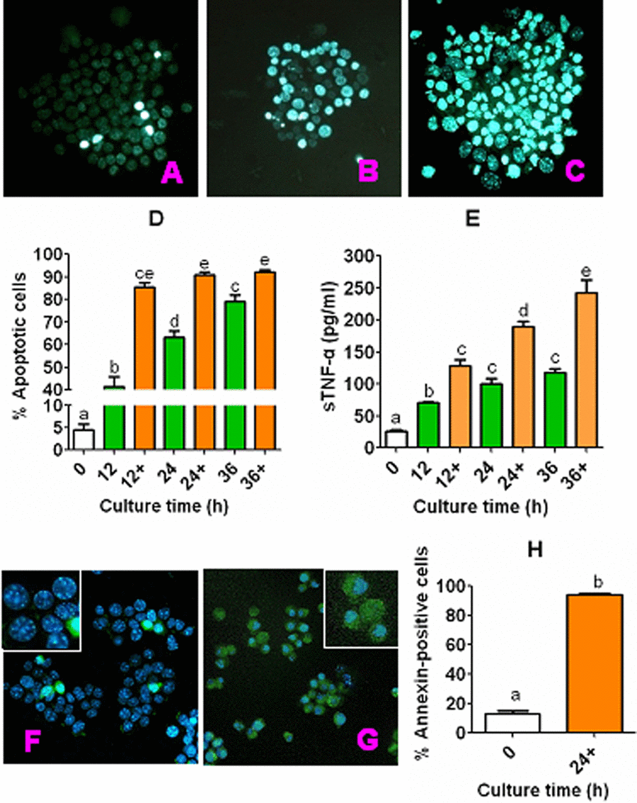 CCs recovered from newly ovulated oocytes were cultured in CZB medium alone or with 200 µM H2O2, and at different times of the culture, rates of apoptotic cells were observed following Hoechst or annexin-V staining, and concentrations of sTNF-α in the conditioned medium (CM) were measured. The results of Hoechst staining showed that percentages of apoptotic CCs increased with culture time in either CZB alone or with H2O2, and at each time point, the apoptotic percentage was significantly higher with than without H2O2 (Fig. 1A to D). The concentrations of sTNF-α also increased significantly with culture time, and were significantly higher with than without H2O2 (Fig. 1E). Our annexin-V staining (Fig. 1 F to H) further confirmed the results from Hoechst staining by showing a similar proportion between the annexin-positive and Hoechst-detected apoptotic cells in both freshly ovulated CCs (13.3 vs. 4.6%) and the CCs cultured for 24 h with H2O2 (93.9 vs. 90.8%). The results suggested that CCs underwent apoptosis and continuously released sTNF-α during in vitro aging, and that H2O2 significantly enhanced apoptosis and sTNF-α secretion in CCs.