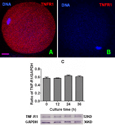 All the detection procedures were conducted at room temperatures unless otherwise mentioned. DOs were washed three times in M2 between procedures. DOs were (1) fixed for 30 min in PBS with 3.7% paraformaldehyde; (2) zona pellucida were removed by a 10-second treatment with 0.5% protease in M2; (3) permeabilized with 0.1% Triton X-100 in PBS at 37.5°C for 10 min; and (4) blocked with 3% BSA in PBS at 37.5°C for 30 min. For TNF-R1 detection, the blocked oocytes were first incubated at 4°C overnight with rabbit polyclonal anti-TNF-R1 (IgG, 1:100, Abcam) in 3% BSA in M2 medium, and then, with Cy3-conjugated goat-anti-rabbit IgG (1:800, Jackson ImmunoResearch) in 3% BSA in M2 for 1 h. Finally, the oocytes were incubated for 10 min with 10 µg/ml Hoechst 33342 in M2 to stain chromatin. Samples in which the primary antibody was omitted were also processed to serve as negative controls. For tubulin staining, the blocked DOs were first incubated at 37°C for 1 h in PBS containing FITC-conjugated anti-α-tubulin monoclonal antibodies (1:50), and then, incubated for 10 min with 10 µg/ml Hoechst 33342 in M2 to stain chromatin. The stained oocytes were mounted on glass slides as follows. Oocytes were transferred with as little accompanying medium as possible to the center of 4 wax spots on a microscopic slide. The wax was made of 15 parts of vaseline, 1 part of paraffin and a small amount of bee wax; mixed by melting and applied to the slide with a needle. The oocytes were then pushed together with a needle, compressed moderately under a coverslip, and observed with a Leica laser scanning confocal microscope (TCS SP2). Blue diode (405 nm), argon (488 nm), and helium/neon (543 nm) lasers were used to excite Hoechst, FITC, and Cy3, respectively. Fluorescence was detected with bandpass emission filters: 420–480 nm for Hoechst, 505–540 nm for FITC, and 560–605 nm for Cy3, and the captured signals were recorded as blue, green and red, respectively.