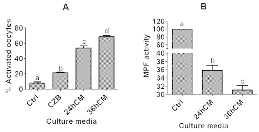 To determine that mouse CCs facilitate oocyte aging by releasing sTNF-α, mouse DOs collected 13 h post hCG were cultured for 12 h in CZB, or in CM collected at 24 or 36 h of CCs culture before ethanol activation to assess oocyte activation susceptibility or assay for MPF activity. The results showed that while activation rates were higher, the MPF activity was lower significantly after culture of DOs in 36-h CM than in 24-h CM (Fig. 3). Together with the above results that sTNF-α accumulated with increasing time of CCs culture (Fig. 1E), the results confirmed that CCs facilitated oocyte aging by releasing sTNF-α.