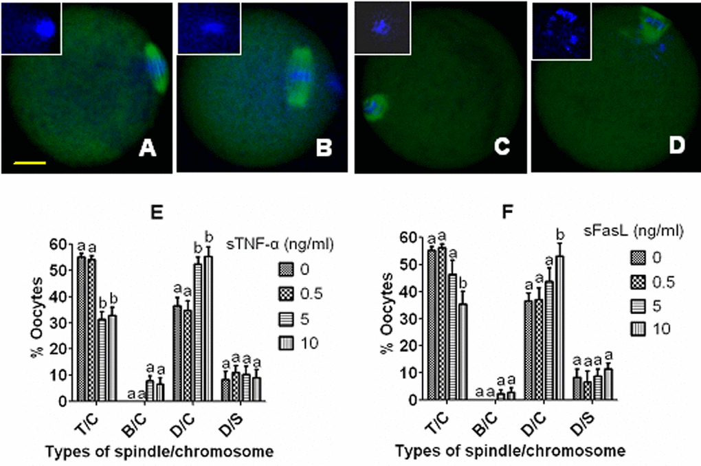Effects of culture with different concentrations of sTNF-α or sFasL on cytoplasmic fragmentation and spindle/chromosome morphology of aging DOs