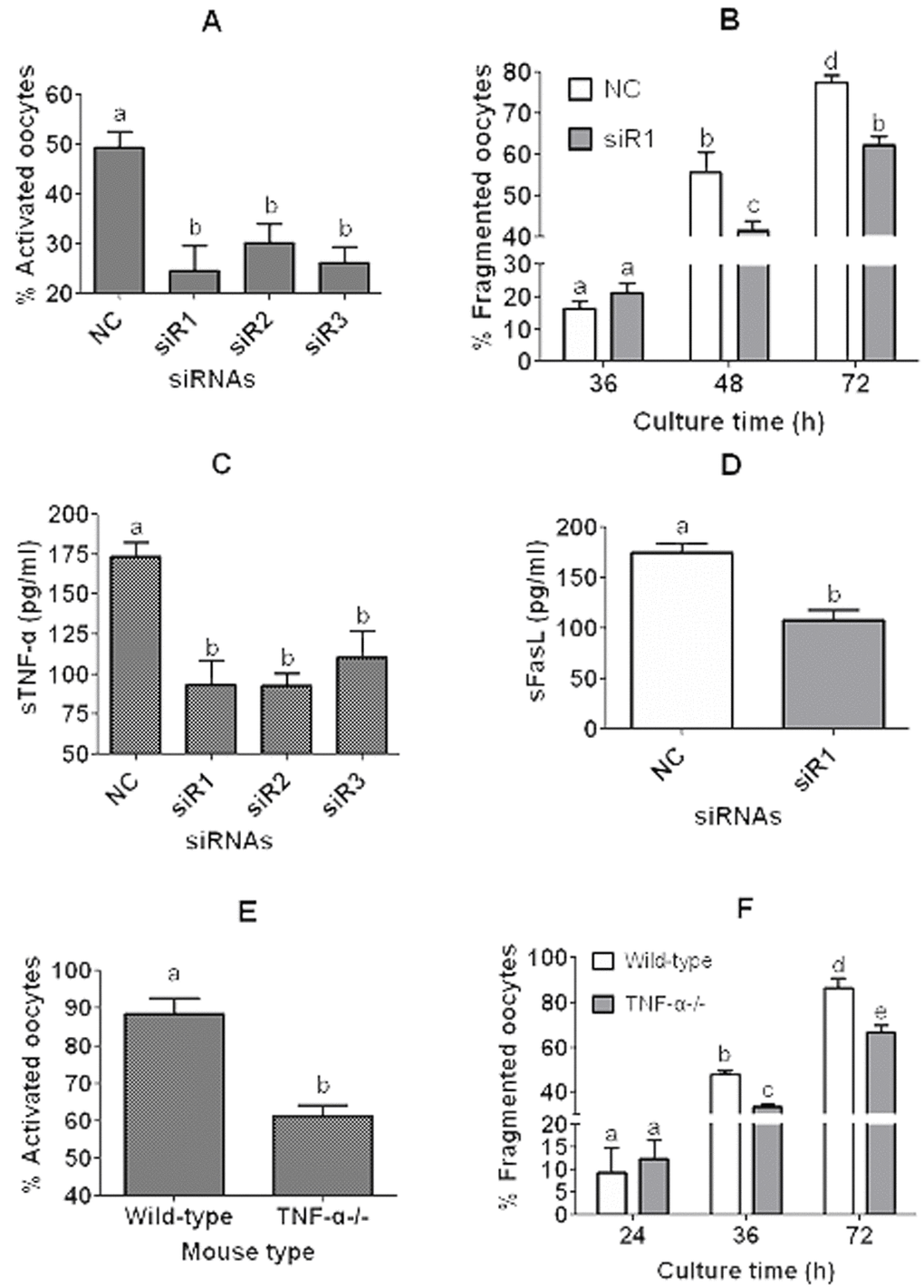 To further verify that CCs facilitate oocyte aging by secreting sTNF-α, two experiments were conducted using TNF-α-knockdown CCs and the COCs from TNF-α-knockout mice, respectively. In the first experiment, expression of TNF-α in CCs was knocked down by RNA interference before CM preparation. Then, DOs recovered 13 h post hCG injection were cultured in the CM for 12 h before examination for rates of ethanol activation or fragmentation. The results showed that oocyte activation rates were significantly lower after culture in CM produced by CCs transfected with any of the three small interfering RNAs against TNF-α than in CM conditioned with CCs transfected with negative control (NC) siRNAs (Fig. 7A). To observe fragmentation rates, the DOs that had been treated for 12 h in CM were cultured in CZB for different times before examination for fragmentation. Up to 36 h of the CZB culture, oocyte fragmentation rates did not differ between the NC siRNA and siRNA-1 groups, but after 48 h of the CZB culture, the fragmentation rate was significantly lower in the siRNA-1 group than in the NC siRNA group (Fig. 7B). Our measurement of sTNF-α in CM indicated that CCs transfected with any of the three small interfering RNAs released significantly less sTNF-α than the CCs transfected with NC siRNAs did (Fig. 7C). Our measurement of sFasL in CM demonstrated that CCs transfected with siRNA-1 produced significantly less sFasL than the CCs transfected with NC siRNA did (Fig. 7D).