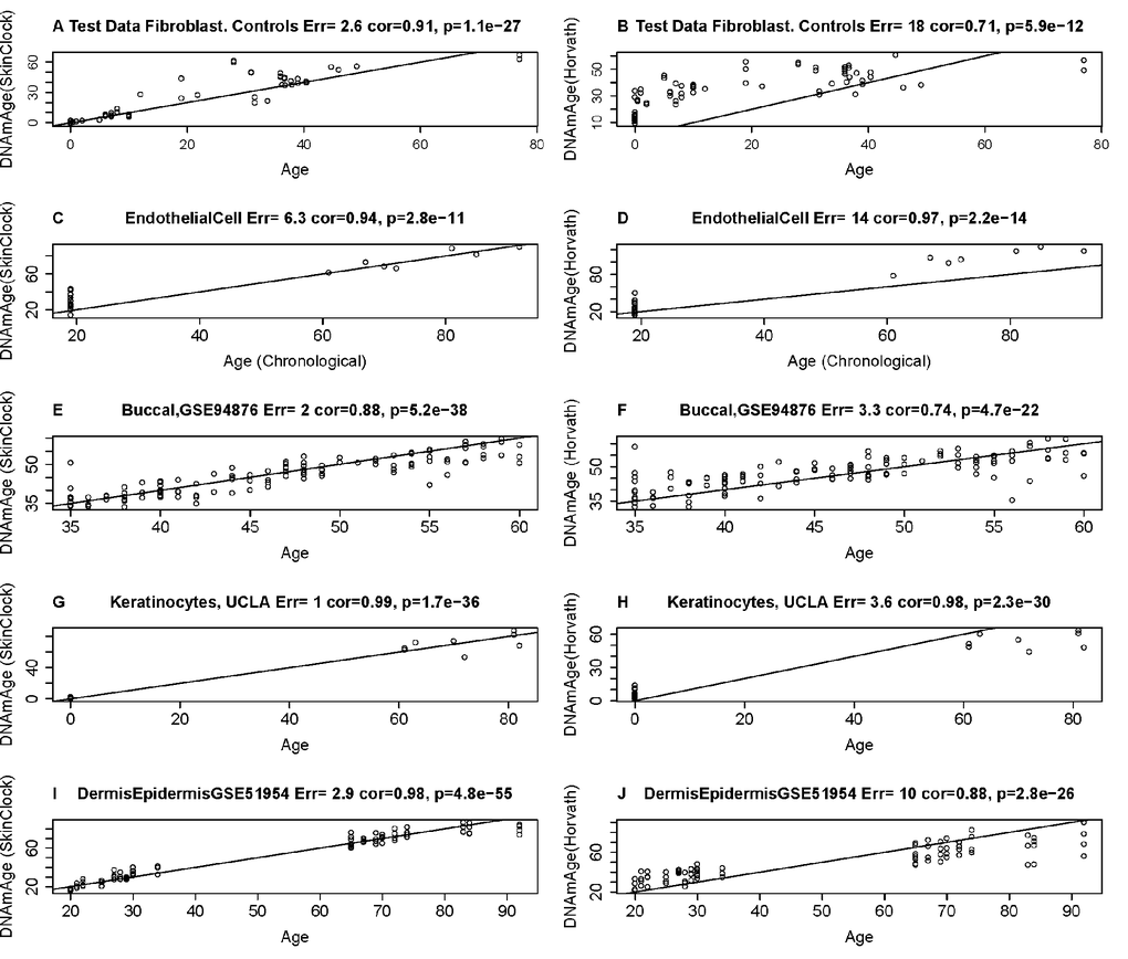 As indicated by its name, the pan-tissue age estimator applies to all sources of DNA (except for sperm) [6]. Despite its many successful applications, the pan-tissue DNAm age estimator performs sub-optimally when used to estimate fibroblast age [6]. This is particularly perplexing because fibroblasts are widely used in ex vivo studies of various interventions. As a case in point, the Progeria Research Foundation provides fibroblast lines derived from skin biopsies from patients with Hutchinson Gilford Progeria Syndrome (HGPS) for use in research. In spite of clear acceleration of clinical manifestations of aging in HGPS, this is not mirrored in epigenetic age measurements by current DNA methylation-based estimators [6]. While this could be due to a genuinely interesting distinction between epigenetic and phenotypic aging, it is also possible that the current epigenetic age estimators fail to capture aspects of aging that are specific to fibroblasts and epithelial cells. The discernment between the two possibilities requires an age estimator that is well-suited for accurately measuring the epigenetic age of fibroblasts. However, an epigenetic age estimator that is highly accurate and equally compatible with fibroblasts and other readily accessible human cells is currently not available. Such an epigenetic age estimator would be very valuable in performing ex vivo experiments because it would allow testing anti-aging properties of new compounds in human cells and minimize the need to carry out such tests in humans. Ex vivo studies often employ keratinocytes, fibroblasts and microvascular endothelial cells, which can be readily isolated from skin biopsies.