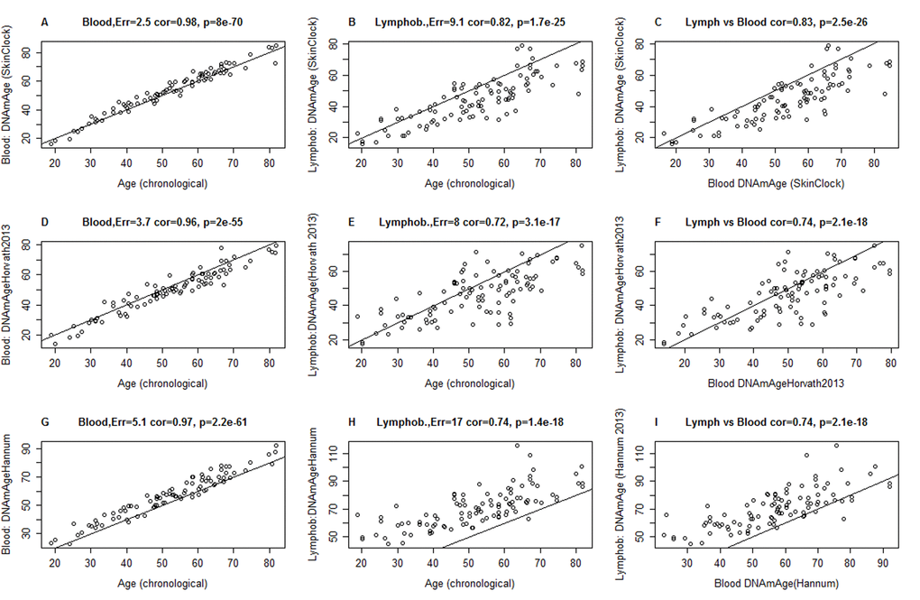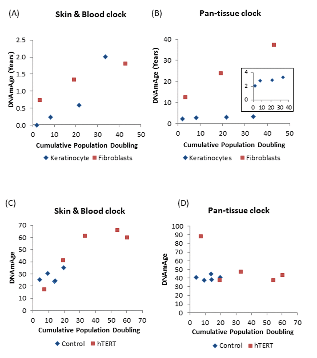 The performance of the skin & blood clock is equally impressive when applied to ex vivo cell culture system. Studies with fibroblasts and endothelial cells revealed that increase in population doublings is significantly associated with increased DNAm age including hTERT immortalized cells, which corroborates the findings in previous studies [41,42].