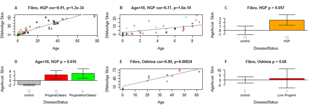 The skin & blood that we derived is well-suited to meet all these needs. By applying it to fibroblasts from HGPS cases, we detect a significant epigenetic age acceleration effect after adjusting for fibroblast population doubling levels. For reasons yet to be determined, the pan-tissue DNA methylation age estimator failed to detect this subtle increase in epigenetic age acceleration. In considering the modest increase in age acceleration of HGPS cells, it is worth noting that changes in the methylation state of clock CpGs in the early years of life already occur at a frenetic rate, which is approximately twenty-four times greater than that which takes place after the age of twenty [6]. Hence, it is difficult to envisage that the accelerated rate of epigenetic aging in HGPS cells from young donors could be very much greater in magnitude. This hypothesis can in theory be tested by measuring the epigenetic age of HGPS cells from patients older than twenty years of age, when the basal rate of normal epigenetic aging is significantly reduced, allowing for any age acceleration to become even more apparent. It is however difficult to achieve this as the median age of death of HGPS patients is approximately 14 years old. The ability of the skin & blood clock to nevertheless detect epigenetic age acceleration in young HGPS patients over and above an already very high normal background rate, attests to its sensitivity.