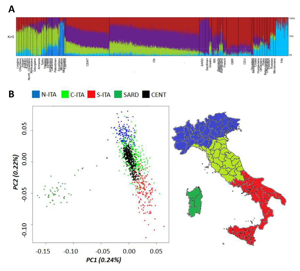- 13. Sazzini M, Gnecchi Ruscone GA, Giuliani C, Sarno S, Quagliariello A, De Fanti S, Boattini A, Gentilini D, Fiorito G, Catanoso M, Boiardi L, Croci S, Macchioni P, et al. Complex interplay between neutral and adaptive evolution shaped differential genomic background and disease susceptibility along the Italian peninsula. Sci Rep. 2016; 6:32513. https://doi.org/10.1038/srep32513 [PubMed]