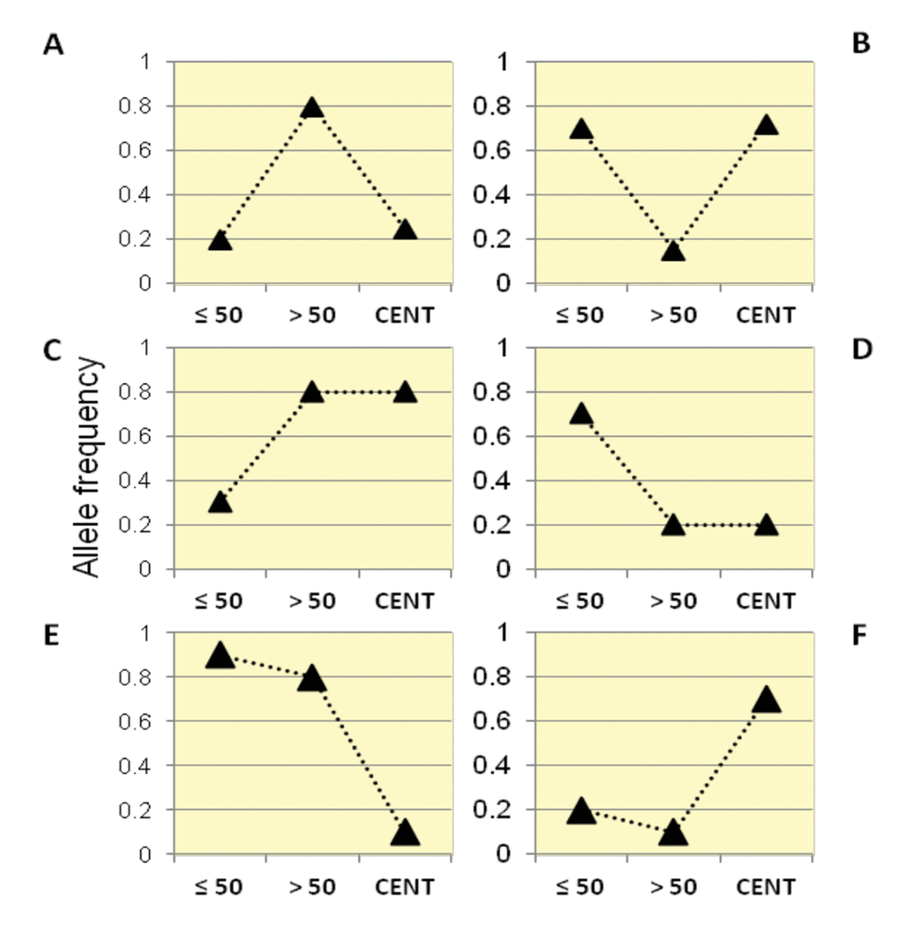 For the analysis of patterns of allele frequency in the Italian population an ad hoc script was used to divide the examined cohort into three different groups: Group 1 included individuals that are less than 50 years old, Group 2 included individuals that are more than 50 years old, Group 3 included the centenarians. Pairwise associations (Group 1 vs. Group 2; Group 1 vs. Group 3; Group 2 vs. Group 3) were calculated by using a logistic model and adding sex as a covariate. All the SNPs with nominal p-values < 0.01 were divided into six classes (Class A, B, C, D, E, F) according to their allele frequency patterns.