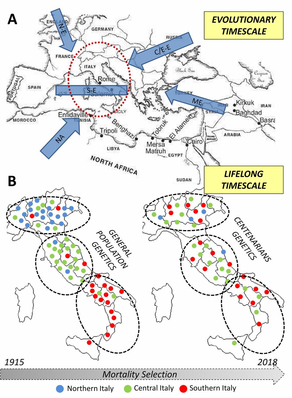 A diachronic approach able to combine information about processes occurred at these different timescales (i.e. evolutionary and lifespan ones) is thus expected to improve the understanding of the genetic bases of human longevity. We therefore applied it to the study of a highly selected cohort of people more than 100 years old and belonging to a population (i.e. the Italian one) whose evolutionary history has been extensively investigated.