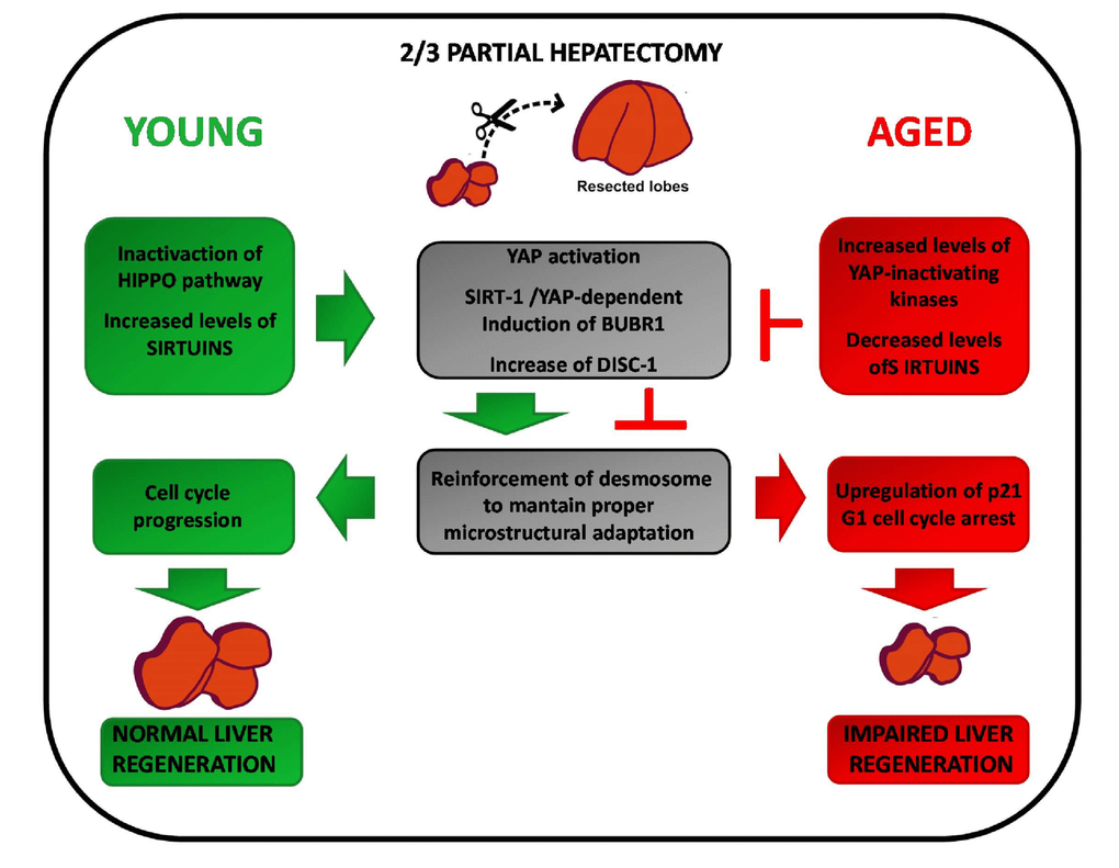 Summarizing, findings here reported attributed the decline of the regenerative response in aged liver to BubR1 reduction which leads to decreased expression of DISC1, a cell adhesion protein involved in tissue reconstitution after damage. Yes-associated protein (YAP).