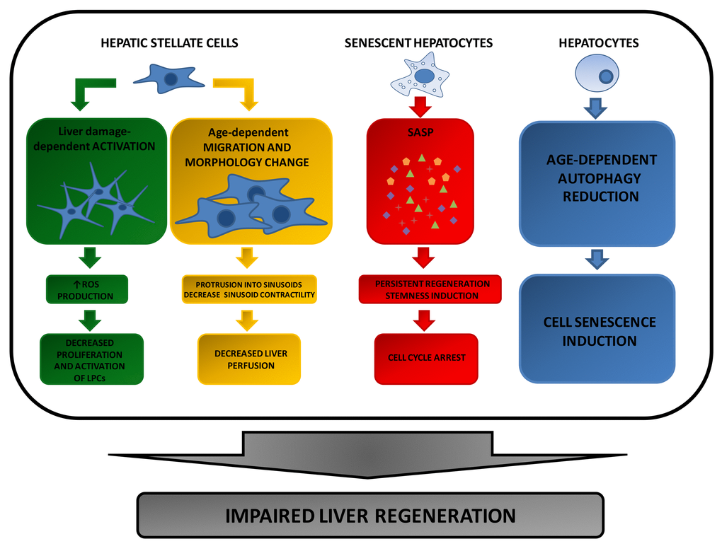 More recently, increasing evidence suggests that the age-dependent decline of the liver regeneration capacity is the consequence of multiple intertwining factors, both intra and extra-cellular, that cooperate to affect liver mass recovery after tissue damage. From the analysis of the latest literature reports, it emerges that the mass recovery of the injured liver in aged animals is compromised by at least three factors: