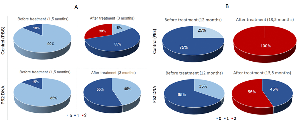 Another experiment was conducted testing if the plasmid effects progression of AMD in the older animals (Figure 1B). Examination of these animals at the age of 12 months revealed that all animals had signs of retinopathy in at least one eye. 75 percent of eyes in the control group manifested changes corresponding to the AMD predisciform stage (1 a.u.) and 25% did not have the signs of retinopathy. In the experimental group, 65% of eyes had changes corresponding to the predisciform stage (1 a.u.) and 35% of rats did not have the signs of retinopathy. Statistical analysis showed that retinopathy continued to progress in both control and experimental groups but p62DNA reduced the severity of pathological changes in the eyeground of OXYS rats (p < 0.001). By the time of the second eye inspection at the age of 13.5 months, all the eyes in the control group had signs of retinopathy corresponding to the 2nd stage of AMD (2 a.u.). At the same time, p62DNA-treated OXYS rats demonstrated pathological changes corresponding to the 1st stage of AMD in the 45% of retinas, and to the 2st stage - in the 55% of eyes. These data indicate that administration of p62DNA in the prophylactic setting significantly delays development of AMD signs and alleviates the severity of the disease.