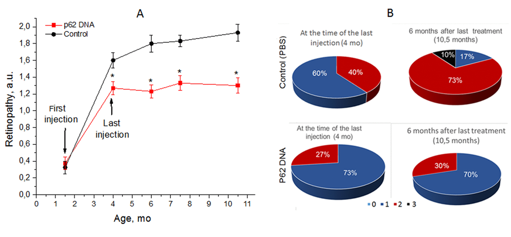 In the first series of experiments, we assessed possible prophylactic effects of p62DNA against the development of retinopathy. Set of six p62DNA weekly injections started at the age of 1.5 months prior to any signs of retinopathy. Preliminary examination of rats at the age of 1.5 months showed that in experimental and control groups of OXYS rats signs of the 1st stage (1 a.u.) of retinopathy were present in 15 and 10% of animals, respectively. Five injections of the p62DNA ones a week (from 1.5 months of age) significantly slowed down development of retinopathy in OXYS rats (Figure 1A). Indeed, by the age of 3 months, 55% of eyes in the control group developed the signs of the 1st stage of retinopathy, 30% developed the 2nd stage, and only 15% of eyes remained without the signs of the disease. In contrast, in the p62DNA treated group, 55% of eyes developed the signs of the 1st stage of retinopathy, while the rest 45% of eyes did not show any signs of degeneration. Accordingly, statistical analysis showed that the average level of retinopathy in the p62DNA-treated OXYS rat’s eyes was 2.5 times lower than in the control animals (0.45±0.11 and 1.15±0.15 a.u., p < 0.001, respectively).