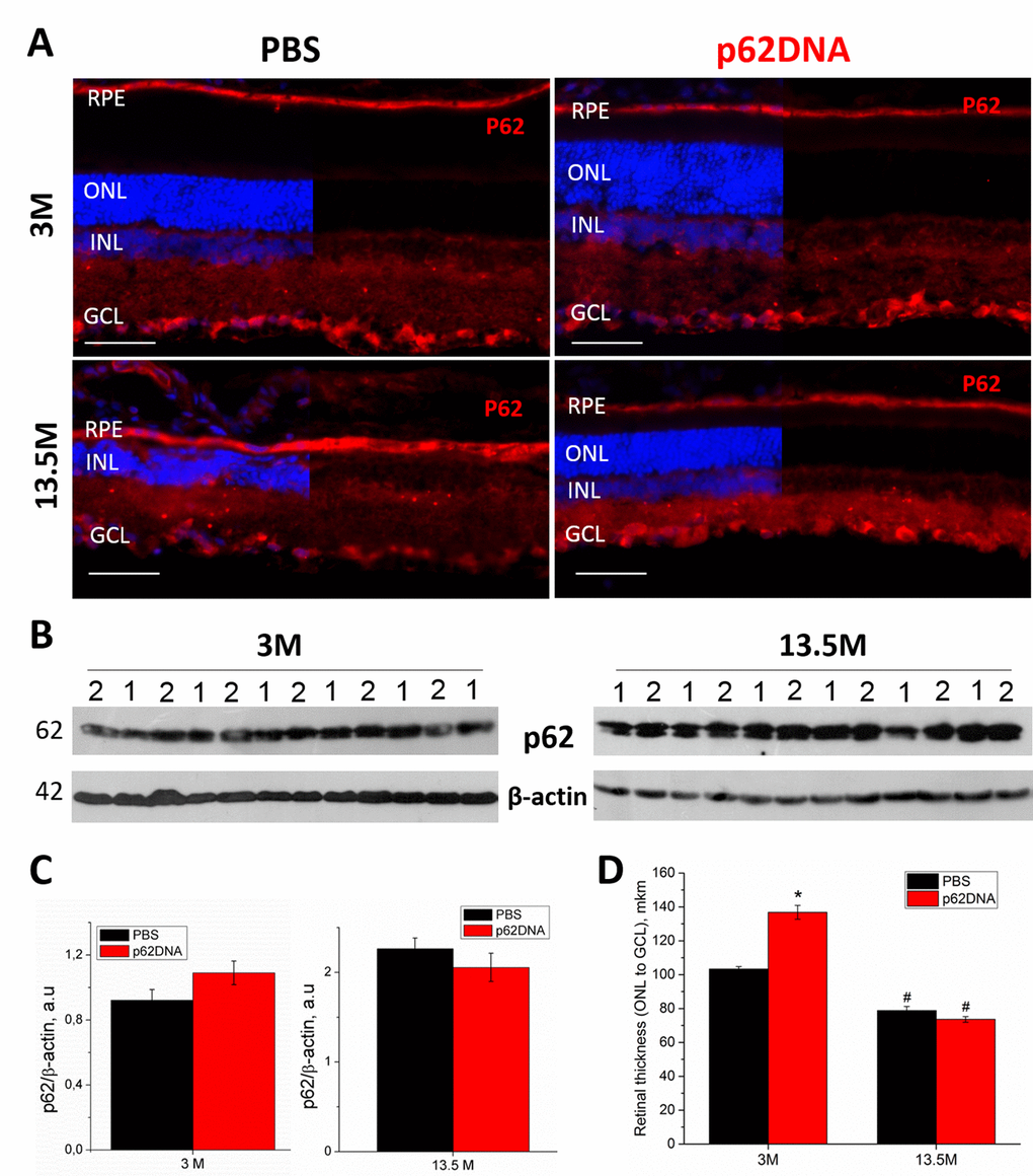 Western blot analysis and immunohistochemistry were performed to determine expression of p62 in the retina of 3- and 13.5-month-old OXYS rats receiving injections of PBS (vehicle control) or p62DNA (Figure 3A-C). Immunohistochemical staining of the retinal slices revealed strong p62 expression in the RPE cells and around the nuclei of the inner nuclear (INL) and ganglion cells layers (GCL) in both control and treated animals. P62 expression was weaker in outer and inner plexiform layers (OPL and IPL) in rats of all groups (Figure 3A) (n=4 p62DNA, n=4 PBS). Also, immunostaining revealed p62 granules in plexiform layers, and the number of these granules increased with age. However, we did not detect any significant differences in the p62 immunostaining between plasmid-treated and PBS groups. The lack of difference in expression of p62 protein in rat retina in control and following p62DNA administration either at 3 months or 13.5 months old animals was further confirmed by immunoblotting with anti-p62 antibody (Figure 3B-C) (n=6 p62DNA, n=6 PBS).