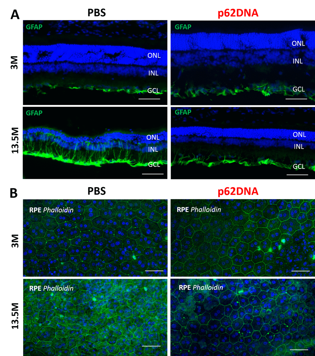 Upregulation of glial fibrillary acidic protein (GFAP) is a well-established indicator of retinal injury and reactive gliosis [19]. Accordingly, we investigated expression of GFAP by immunohistochemistry with the corresponding antibody. At the age of 3 months, GFAP staining was mainly confined to astrocytes and ganglion cell layer at the inner limiting membrane (Figure 4A), and there was no significant difference between levels of GFAP in the retina of p62DNA and PBS groups. By the 13.5 months of age, astrocytes and Müller cells were strongly activated in control animals, as shown by the intense GFAP staining in the macroglial outgrowths from GCL towards the outer limiting membrane beyond ONL, representing massive gliosis (Figure 4A). However, p62DNA treatment strongly reduced, and in some cases completely prevented GFAP upregulation in 13.5-month-old OXYS rats (Figure 4A) (n=4 p62DNA, n=4 PBS). Therefore, administration of p62DNA has a strong preventive effect on multiple hallmarks of developing AMD.