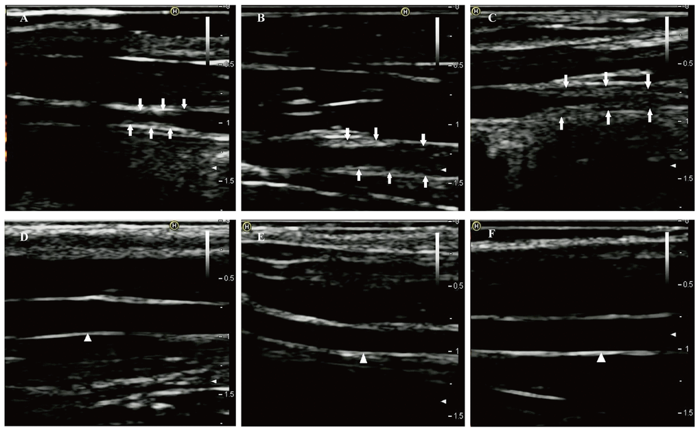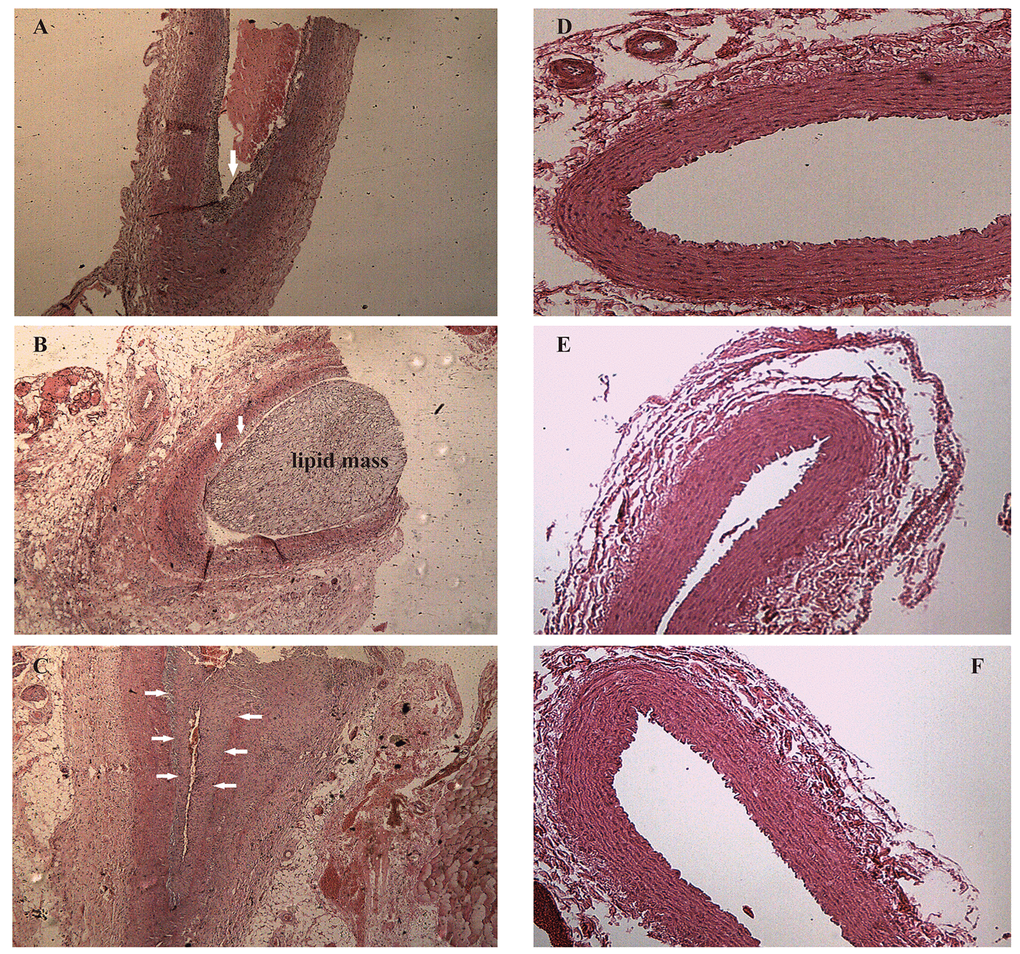 After one week of endothelial injury and high-fat diet, atherosclerotic plaques appeared. The atherosclerotic plaques of the right common carotid arteries were easily detected by the 8th week on the 2D-ultrasound images (Figure 1A-C). However, the carotid arteries of rabbits in the control group had no significant changes and the intima remained smooth (Figure 1D-F). Besides, hematoxylin and eosin stained vessels adjacent to the RNA samples revealed plaques of different severities in the carotid arteries of the case group (Figure 2A-C), while there were no obvious abnormalities in the control group (Figure 2D-F).