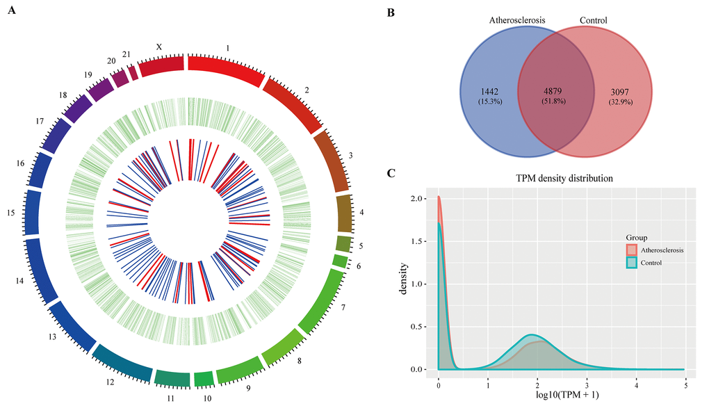 In the present study, we investigated the circRNA, miRNA and mRNA expression profiles of three atherosclerotic rabbits and three controls using RNA-seq. Intriguingly, the expressed circRNAs were widely derived from all chromosomes, including the X chromosome. We found that 159 circRNAs were significantly differentially expressed, including 48 which were upregulated and 111 which were downregulated. At the same time, 813 differentially expressed mRNAs were identified, consisting of 333 upregulated and 480 downregulated mRNAs. In addition, we found 55 upregulated and 58 downregulated miRNAs in atherosclerosis samples. Hierarchical clustering based on the expression value of DERNA demonstrated that atherosclerosis samples clustered together. We also showed that the differentially expressed circRNA transcripts were widely distributed on each chromosome.