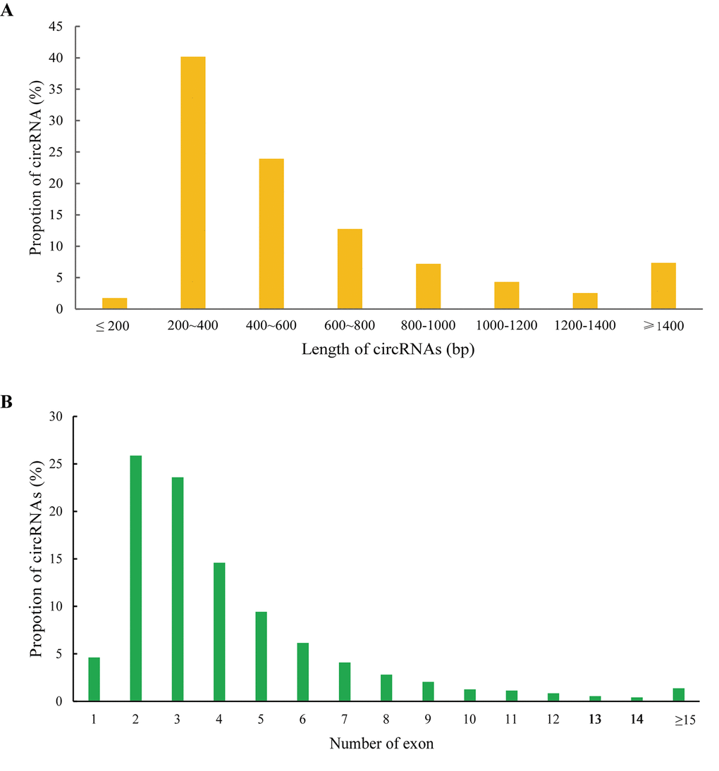 In the present study, we used CIRCexplorer2 to systematically identify and annotate circRNAs. In total, we identified 9,418 circRNAs from 2 groups, including 9,336 exonic EcircRNAs (99.55%) and 82 intronic IcircRNAs (0.45%) with isoforms that were not previously reported. In addition, the circRNA transcripts were broadly distributed in all chromosomes (Figure 3A). Approximately 8.65%, 8.08% and 8.03% came from chr13, chr1 and chr2, respectively, whereas the percentages of circRNA from any other chromosome was less than 7%. As shown in Figure 3B, 6,321 and 7,976 circRNAs were detected in the AS group and control group, respectively, and 4,879 circRNAs were detected in both groups. We used transcripts per million reads (TPM) to estimate the expression level of the circRNA transcripts. Almost all circRNA transcripts were expressed at low levels (Figure 3C). Sequence length analysis revealed that circRNA transcripts were mostly 200-400 bp in length (Figure 4A). In addition, we found the number of exons in circRNA transcripts was mainly range from 2 to 6 (Figure 4B).