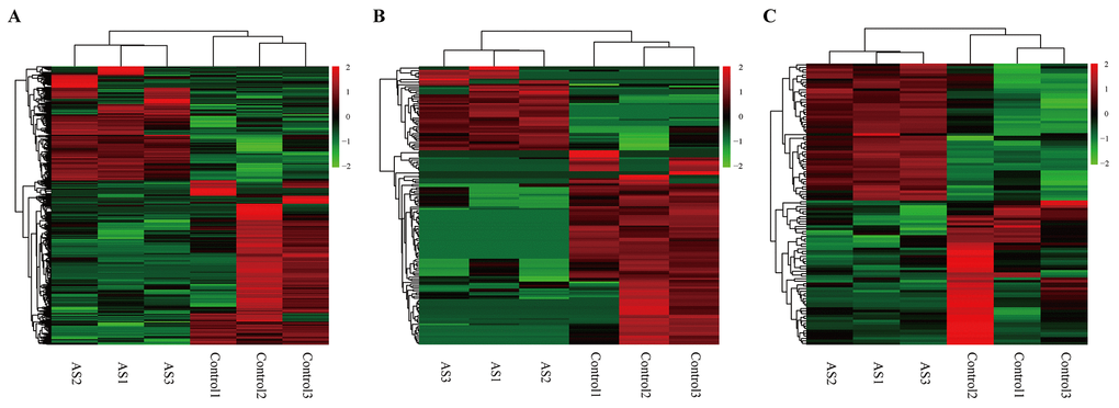 To investigate the possible biological functions of circRNAs in AS, we analyzed miRNA, circRNA and mRNA expression profile data from AS samples and normal controls. RNAs with a fold-change >2 and p-value ≤ 0.05 were identified as significantly differentially expressed. RNA-seq analysis identified 813 mRNAs aberrantly expressed in AS, including 333 upregulated and 480 downregulated mRNAs (Supplementary Table S1). Meanwhile, 48 and 111 circRNAs were upregulated and downregulated, respectively, in AS samples compared to in controls (Supplementary Table S2). In addition, we found 55 upregulated miRNAs and 58 downregulated miRNAs in AS samples compared to controls (Supplementary Table S3). The top 10 dysregulated mRNAs, circRNAs and miRNAs based on p-value were summarized in Table 1, 2 and 3, respectively. Hierarchical clustering showed that DEmiRNA, DEcircRNA and DEmRNA expression patterns among samples were distinguishable (Figure 5). The data suggested that the expressions of miRNAs, circRNAs and mRNAs in AS are different from those in control samples.