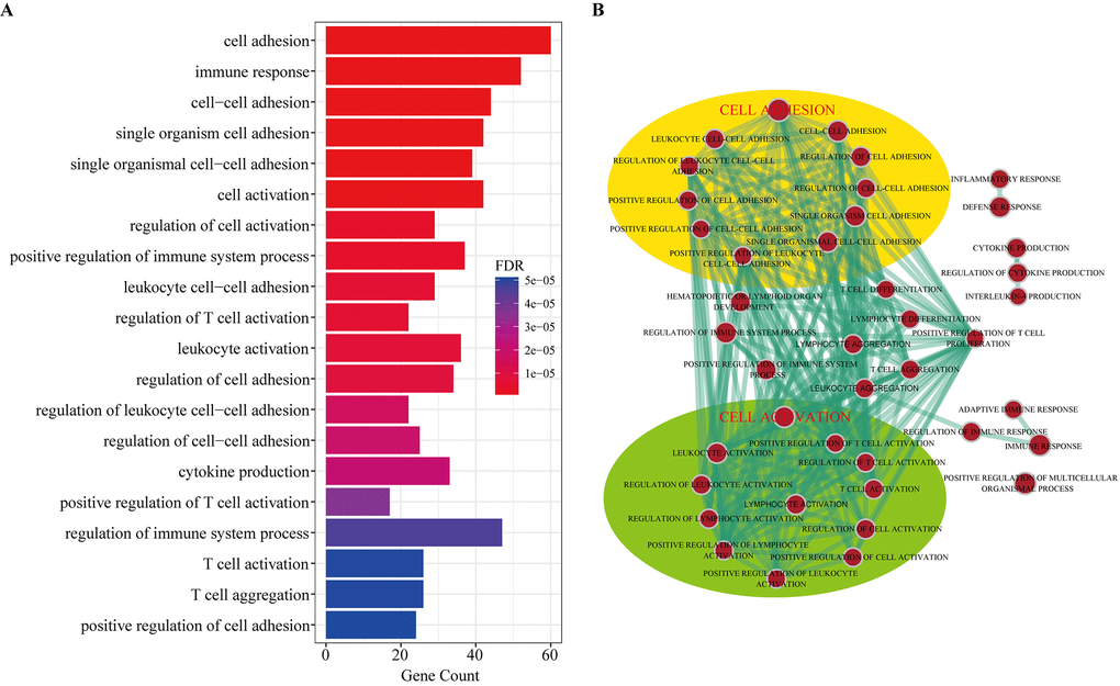 To investigate the potential functional implication of the circRNAs, we performed functional enrichment analysis for all genes in the DEcircRNA-DEmiRNA-DEmRNA triple network based on gene ontology biological process terms. These genes were enriched for 41 GO biological terms (GOTERM-BP-FAT) (FDR cutoff =0.01), and Figure 7A shows the top 20 terms. The top ten enriched GO-BP terms, according to the FDR values, included cell adhesion, immune response, cell-cell adhesion, single organism cell adhesion, single organismal cell-cell adhesion, cell activation, regulation of cell activation, positive regulation of immune system process, leukocyte cell-cell adhesion and regulation of T cell activation. We also visualized and clustered the enriched GO-BP terms using the EnrichmentMap plug-in in Cytoscape (Figure 7B). We found that the enriched GO-BP terms were mainly clustered into cell adhesion and cell activation categories. Furthermore, these enriched GO terms have been implicated in many physiological and pathophysiological activities of atherosclerosis. Therefore, the results indicated that circRNAs act as ceRNAs to regulate mRNAs by competing for shared miRNAs in the pathogenesis of atherosclerosis.