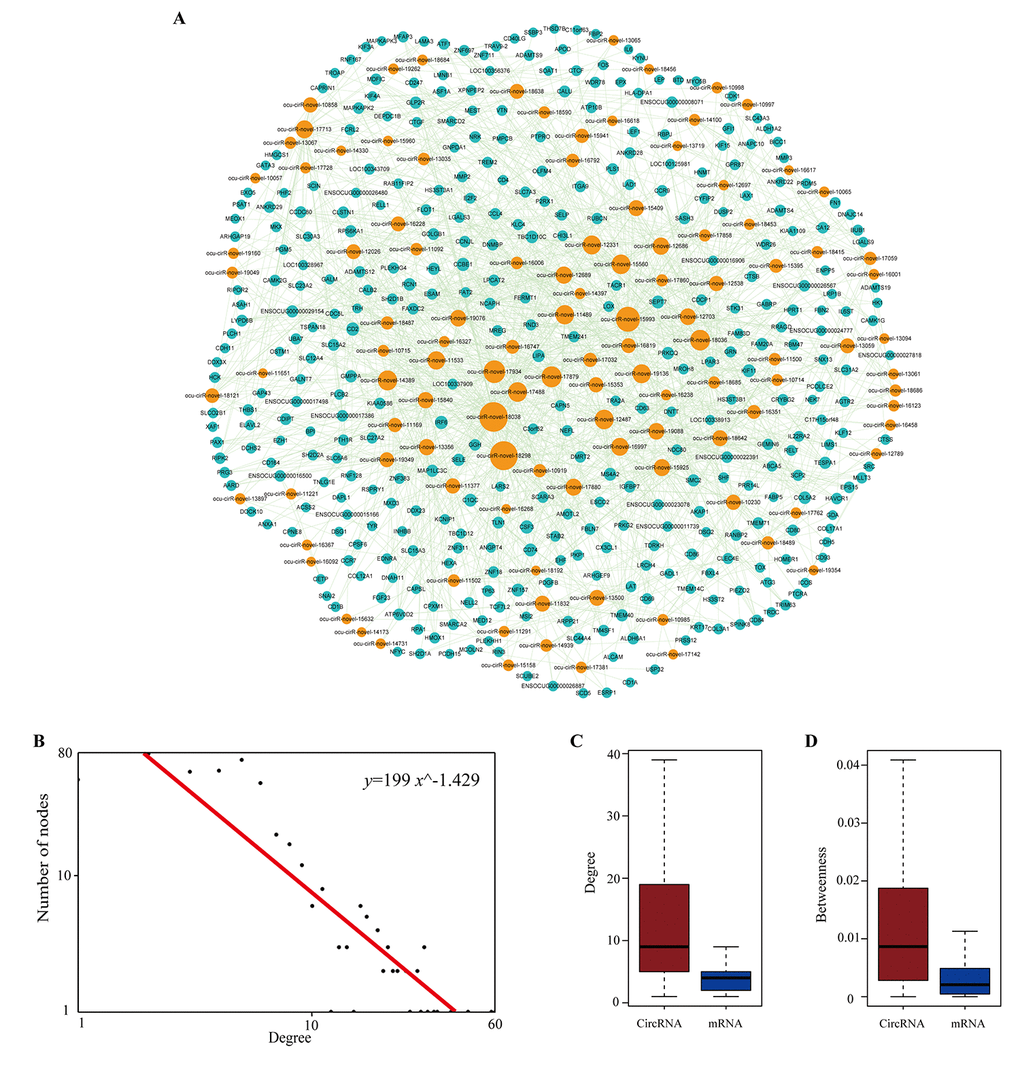 Increasing evidence indicates that circRNAs can sequester relevant miRNAs through MREs to post-transcriptionally regulate gene expression. To investigate ceRNA regulation in atherosclerosis and identify AS-related circRNAs, we identified putative DEmiRNA-DEcircRNA and DEmiRNA-DEmRNA interactions using the miRanda software. In total, we obtained 345 DEmiRNA-DEcircRNA and 2,874 DEmiRNA-DEmRNA interaction pairs. We next extracted miRNAs that paired with both circRNAs and mRNAs to construct the DEcircRNA-DEmiRNA-DEmRNA triple network, which included 81 miRNAs, 115 circRNAs, 399 mRNAs and 3,007 interaction pairs (Figure 6). The degree distribution of the network nodes was investigated. We observed a power-law distribution with a slope of -1.238 and an R-squared value of 0.808. This suggested that the network displayed scale-free characteristics typical of a biological network rather than a random network (Supplementary Figure S1).
